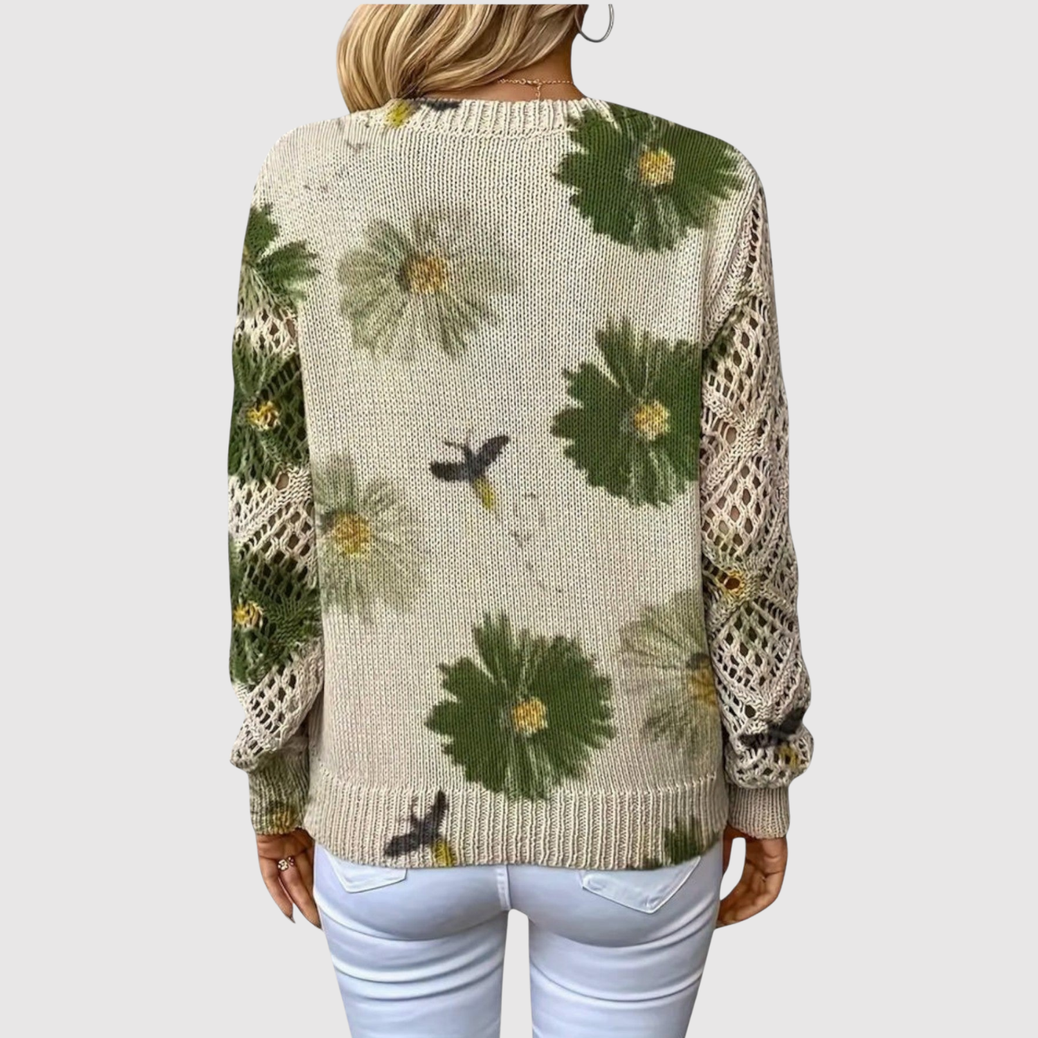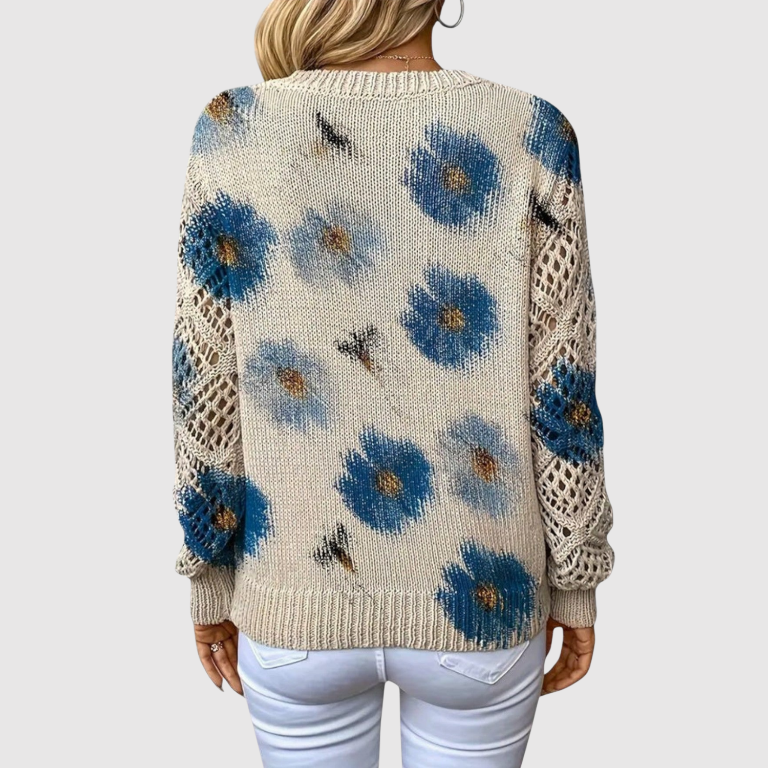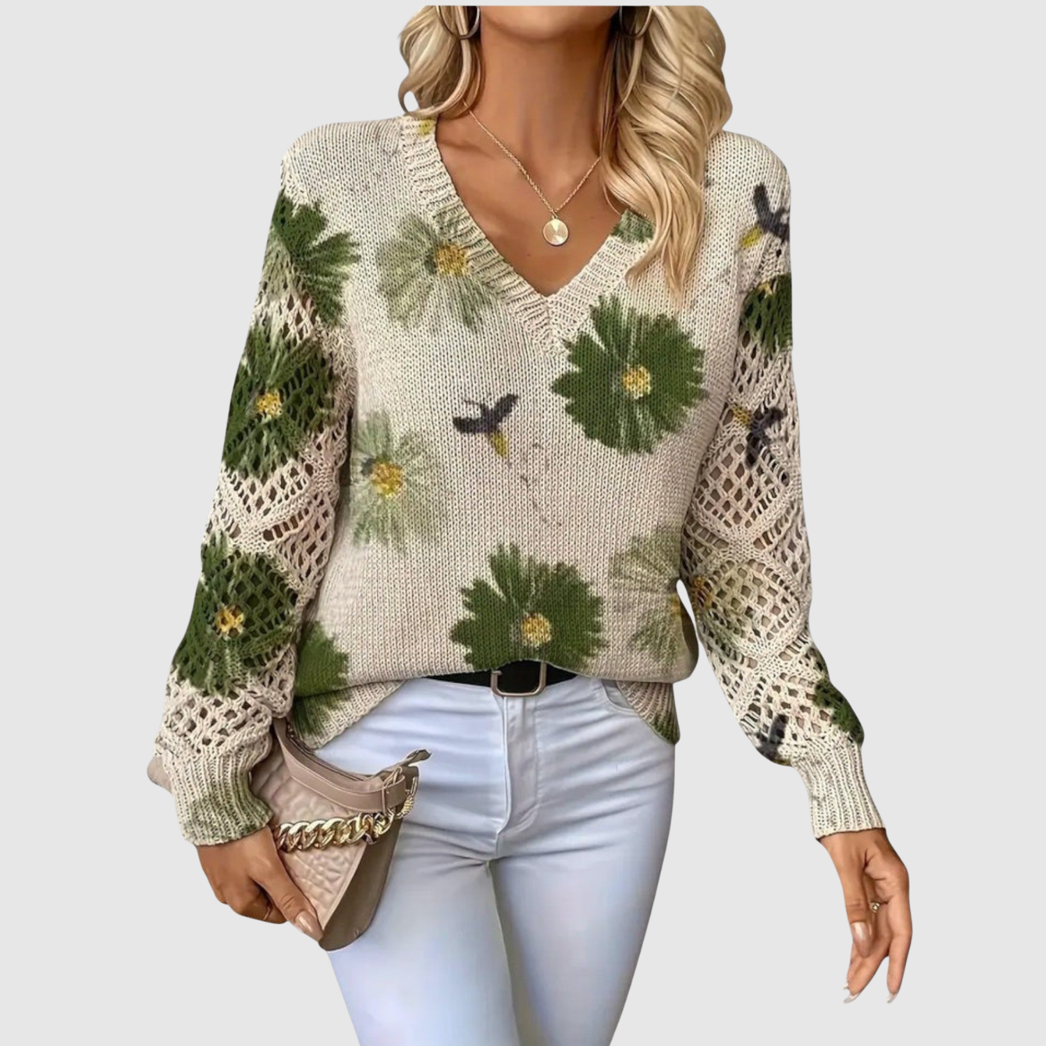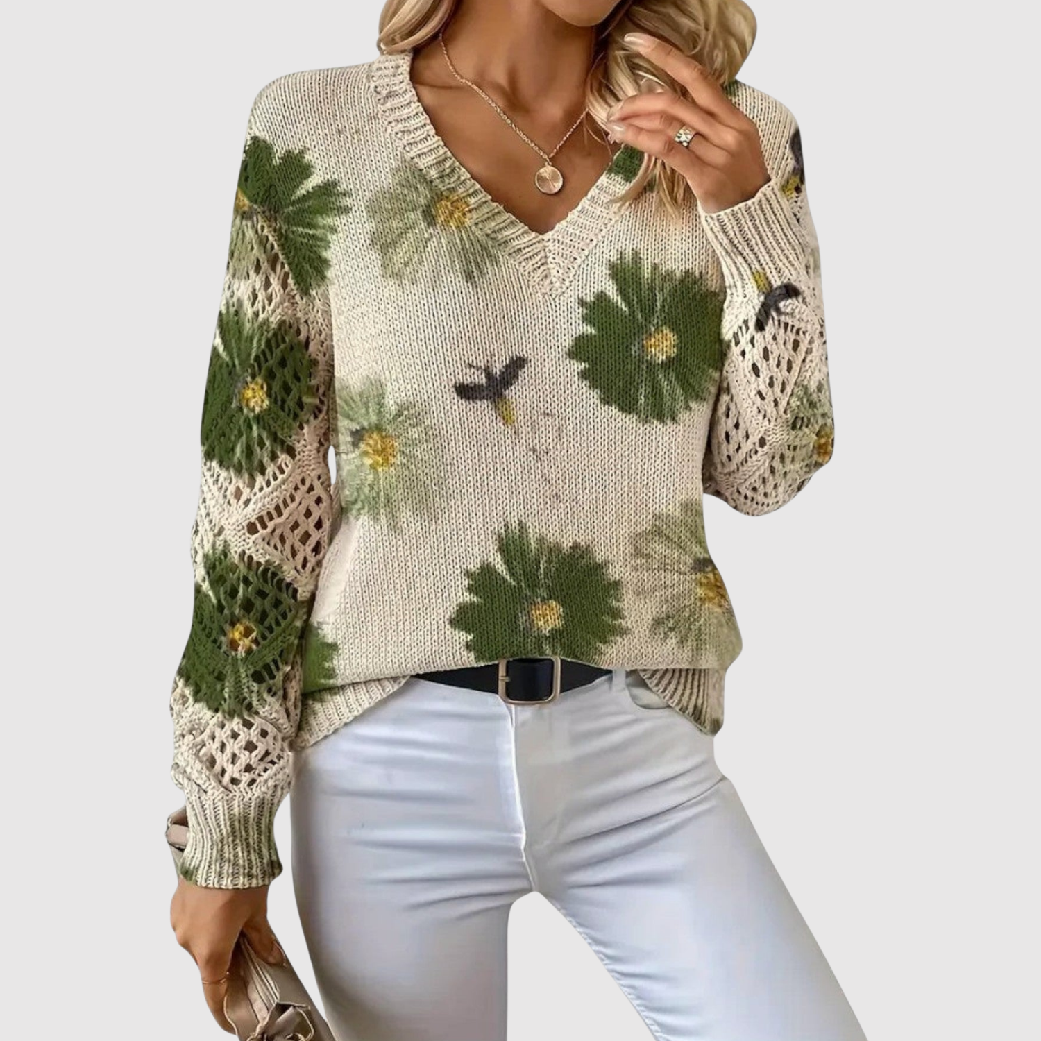 Nora – Sweter z dużymi kwiatami i dekoltem w kształcie V