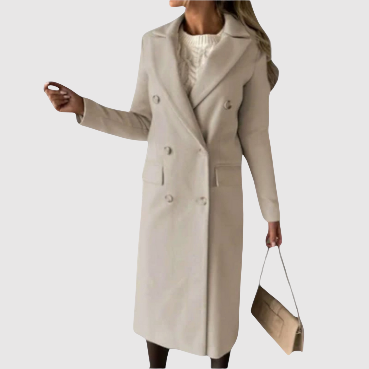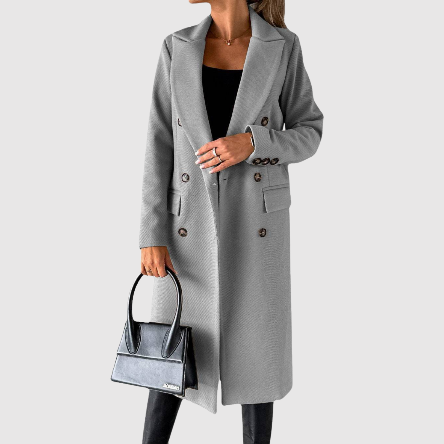 Ten długi płaszcz łączy w sobie wyrafinowanie z funkcjonalnością. Podwójne zapięcie i czyste linie tworzą stylowy wygląd, idealny zarówno na co dzień, jak i na bardziej formalne okazje.