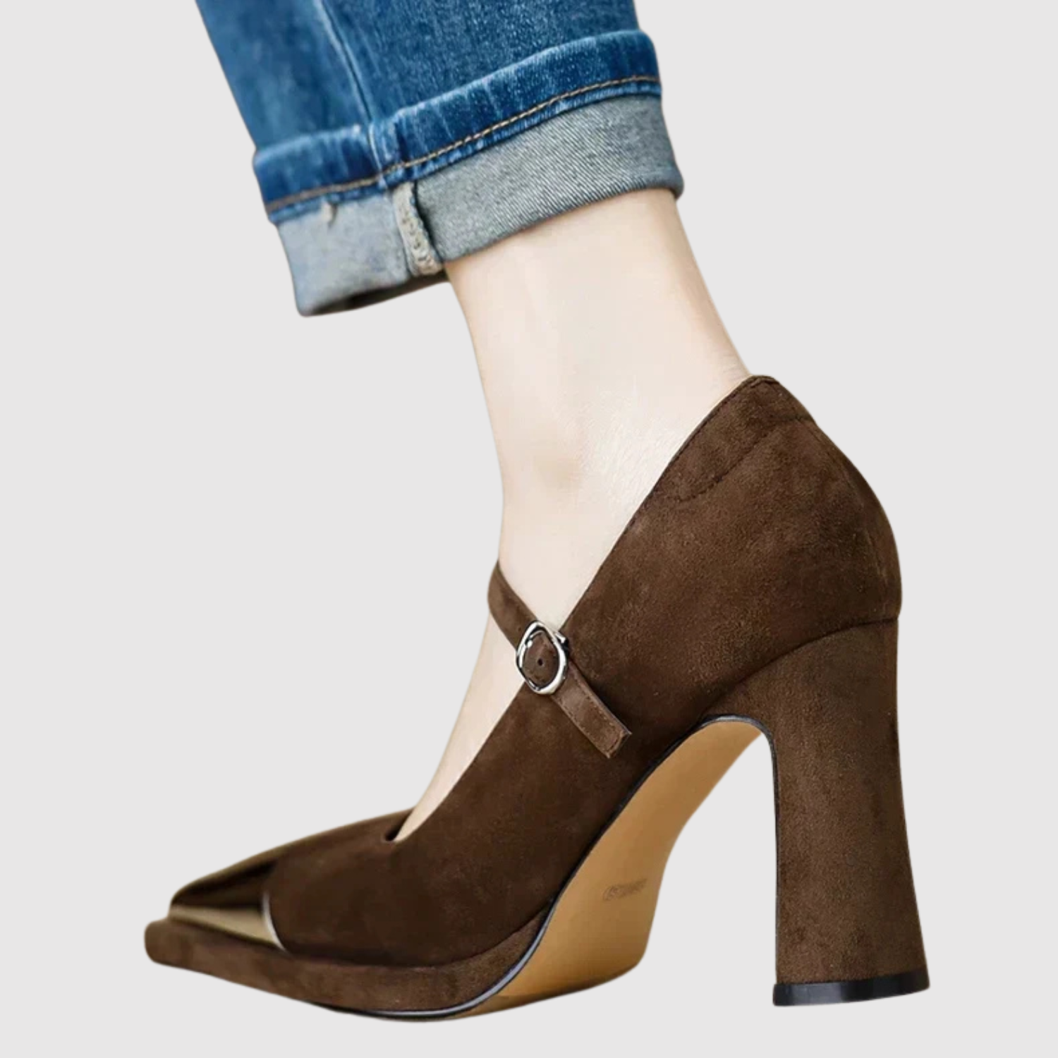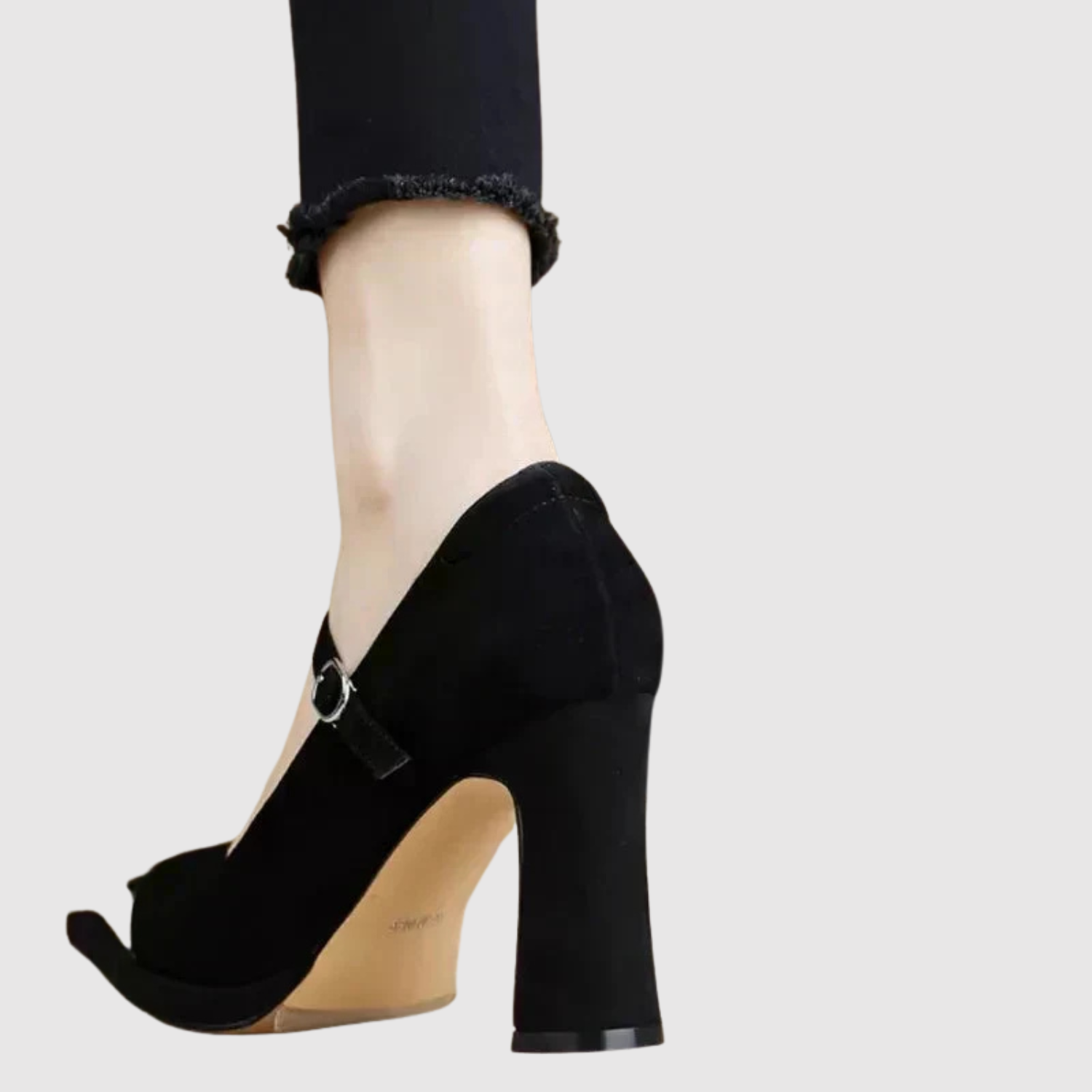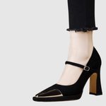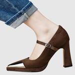 Te buty łączą retro elegancję z nowoczesnym stylem. Wykonane są z wysokiej jakości zamszu z błyszczącym czubkiem i cienkim regulowanym paskiem, który dodaje kobiecej gracji i komfortu nawet przy długotrwałym noszeniu. Doskonały wybór do biura, na wieczorny spacer lub na specjalne okazje.