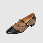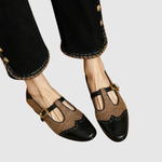 Ten elegancki model łączy retro estetykę z codzienną praktycznością. Wykonane z wysokiej jakości ekologicznej skóry i teksturowanego materiału, buty przyciągają uwagę paskiem T i złotą klamrą. Miękka wewnętrzna warstwa i stabilny niski obcas zapewniają lekkość i komfort przy każdym kroku.