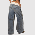 Te dżinsy z niskim stanem łączą nieformalny miejski styl z szeroką sylwetką, która zapewnia komfort i nowoczesny wygląd jednocześnie. Ich design z kontrastowymi szwami dodaje zarówno retro, jak i nowoczesny akcent, co czyni je idealnym wyborem dla tych, którzy chcą wyróżnić się swoją osobowością. Doskonałe do nieformalnych, streetwearowych i wygodnych stylizacji.