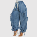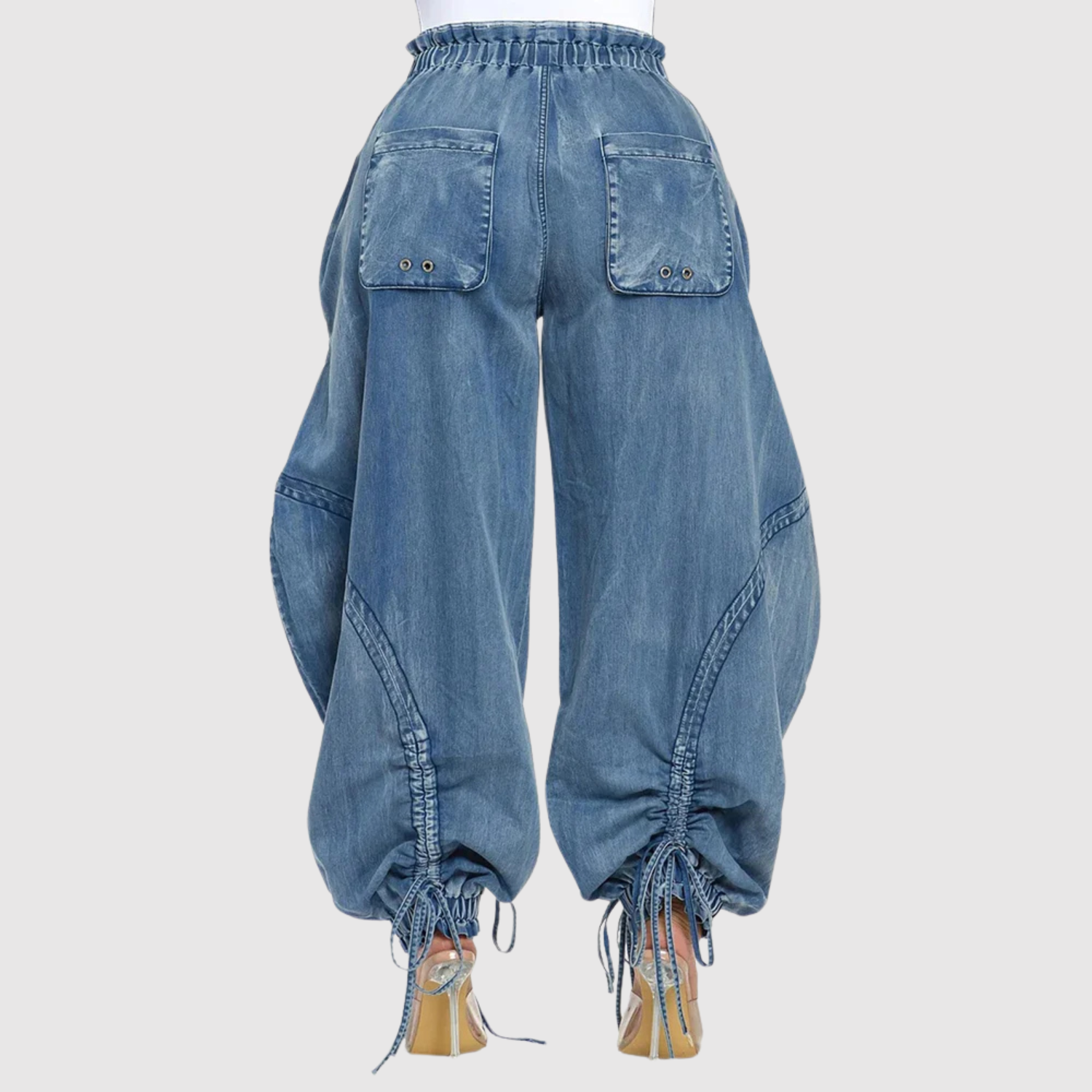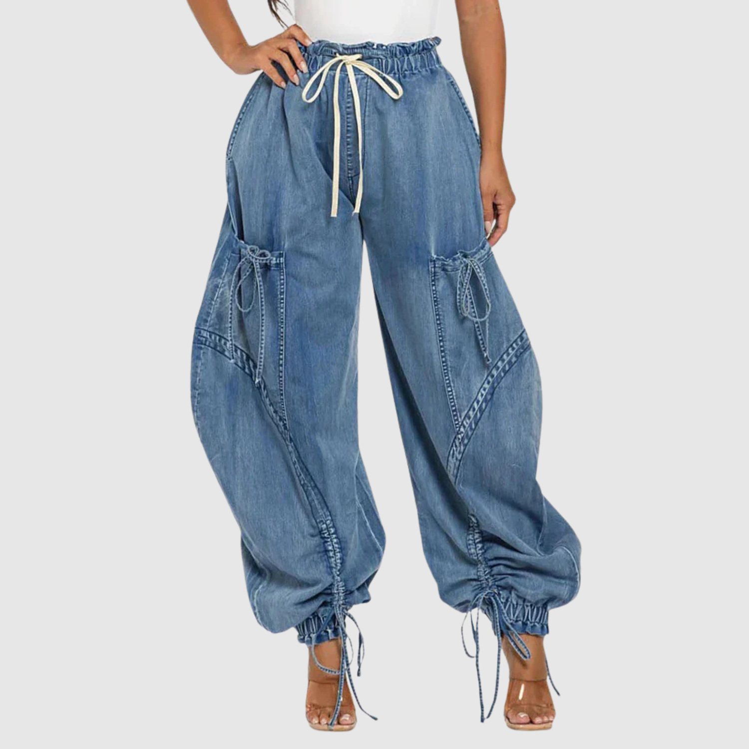 Te luźne dżinsy oferują nieformalny i nowoczesny wygląd. Sznurki dodają unikalny akcent, podczas gdy krój pozostaje wygodny i praktyczny.