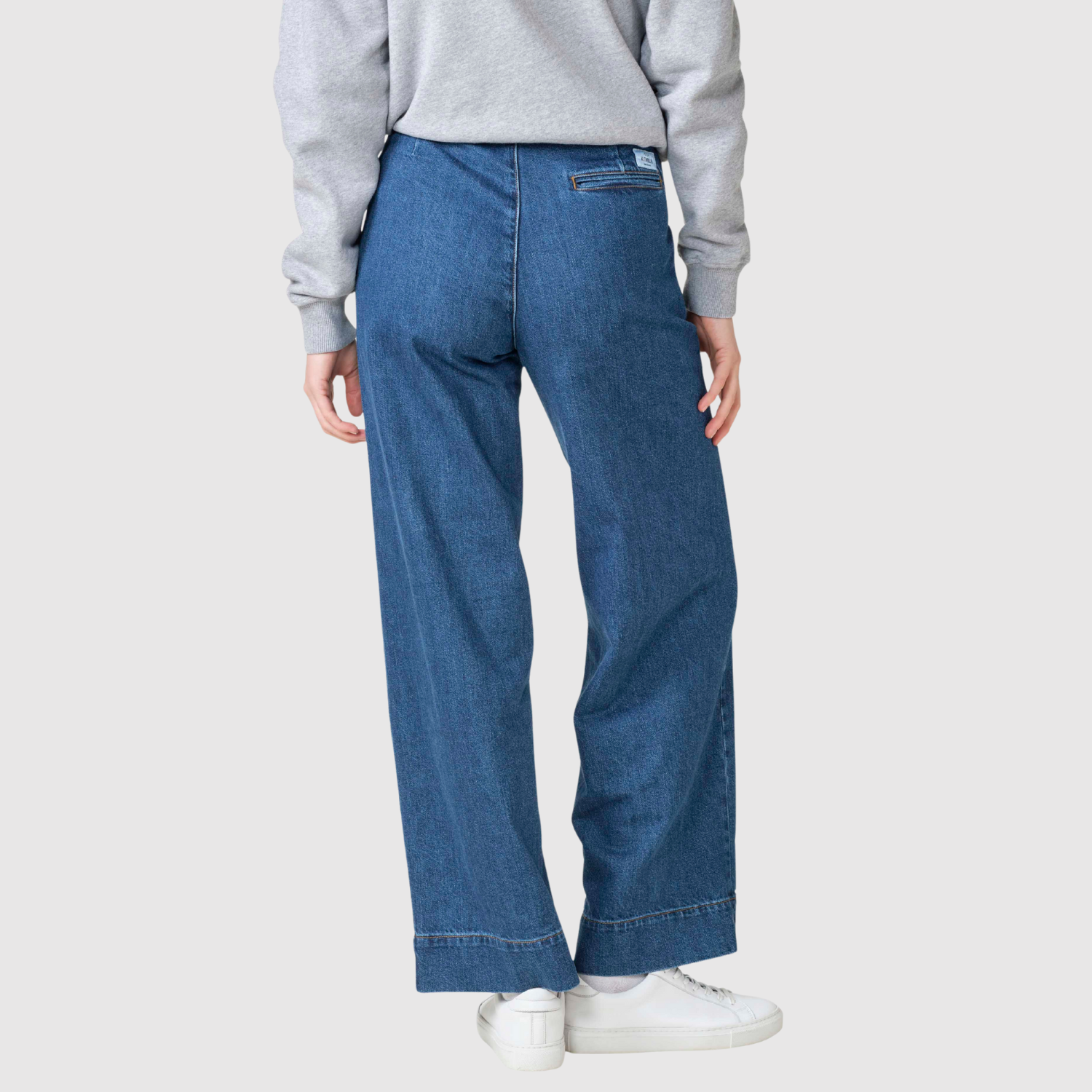 Te szerokie dżinsy łączą komfort i elegancję w prostym designie. Ciemnoniebieskie stone wash nadaje im wyrafinowanego wyglądu, idealnego do codziennego noszenia oraz bardziej dopracowanych stylizacji. Stworzone z myślą o nowoczesnej garderobie z naciskiem na jakość i łatwość stylizacji.