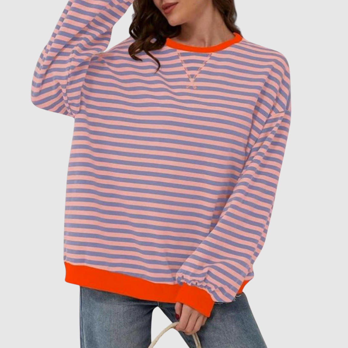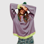 Ten paskowany sweter nadaje zabawny i nowoczesny wygląd, idealny do codziennego noszenia. Miękka jakość zapewnia komfort, podczas gdy świeże kontrastowe kolory dodają energii każdej stylizacji.