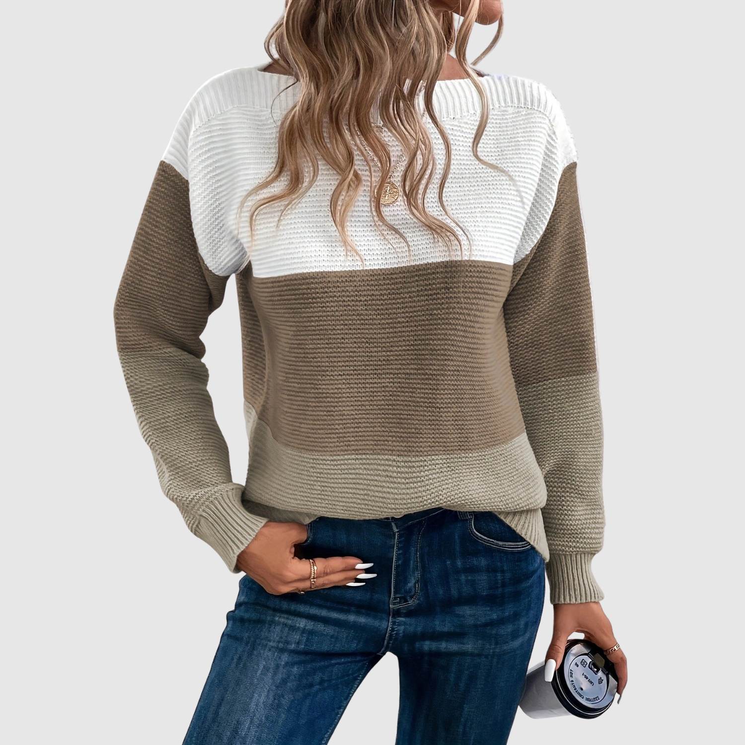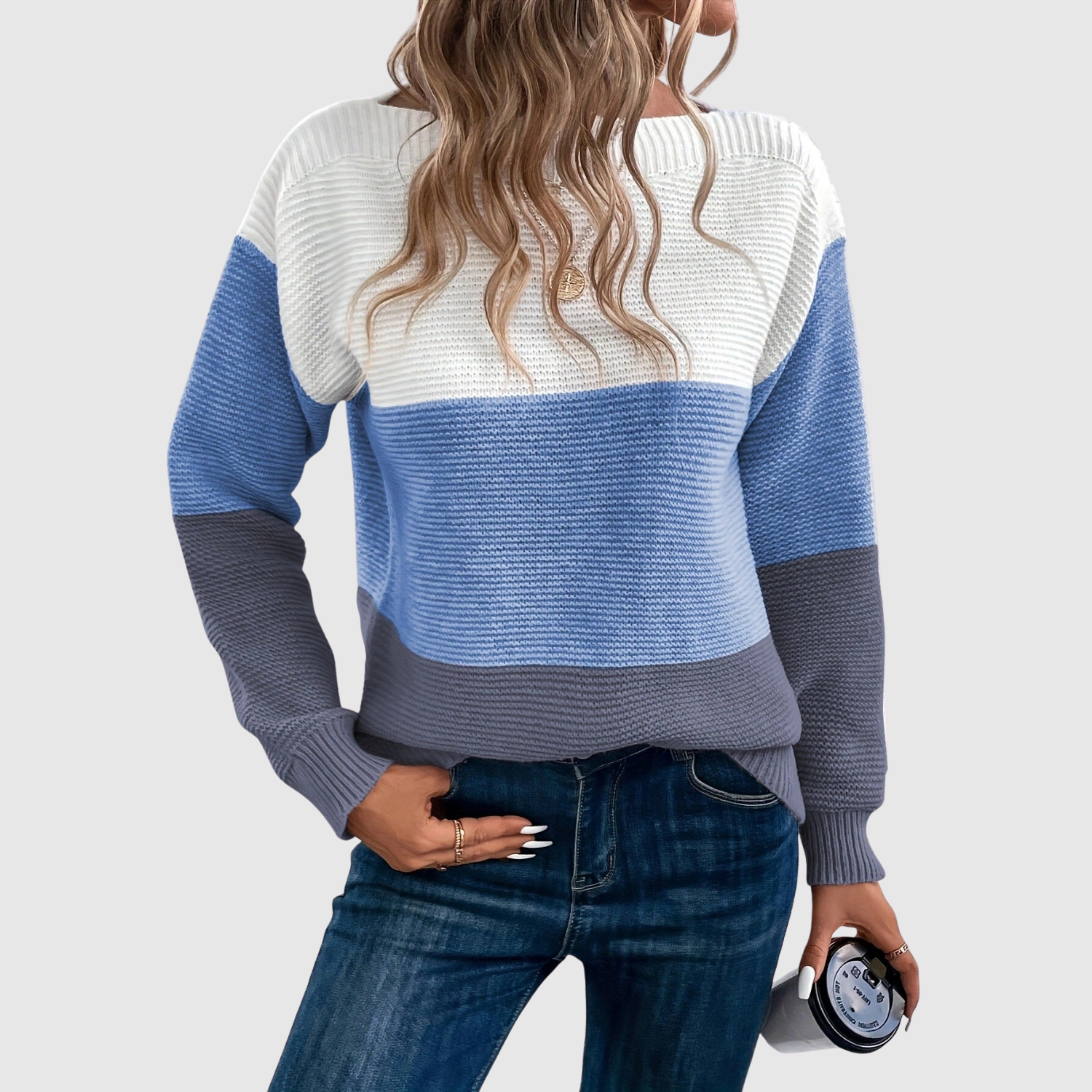 Ten sweter został zaprojektowany z szerokimi kolorowymi blokami, które tworzą stylowy i świeży wygląd. Miękka jakość zapewnia wysoki poziom komfortu, podczas gdy luźny krój sprawia, że jest idealny zarówno na co dzień, jak i na przytulne chwile.