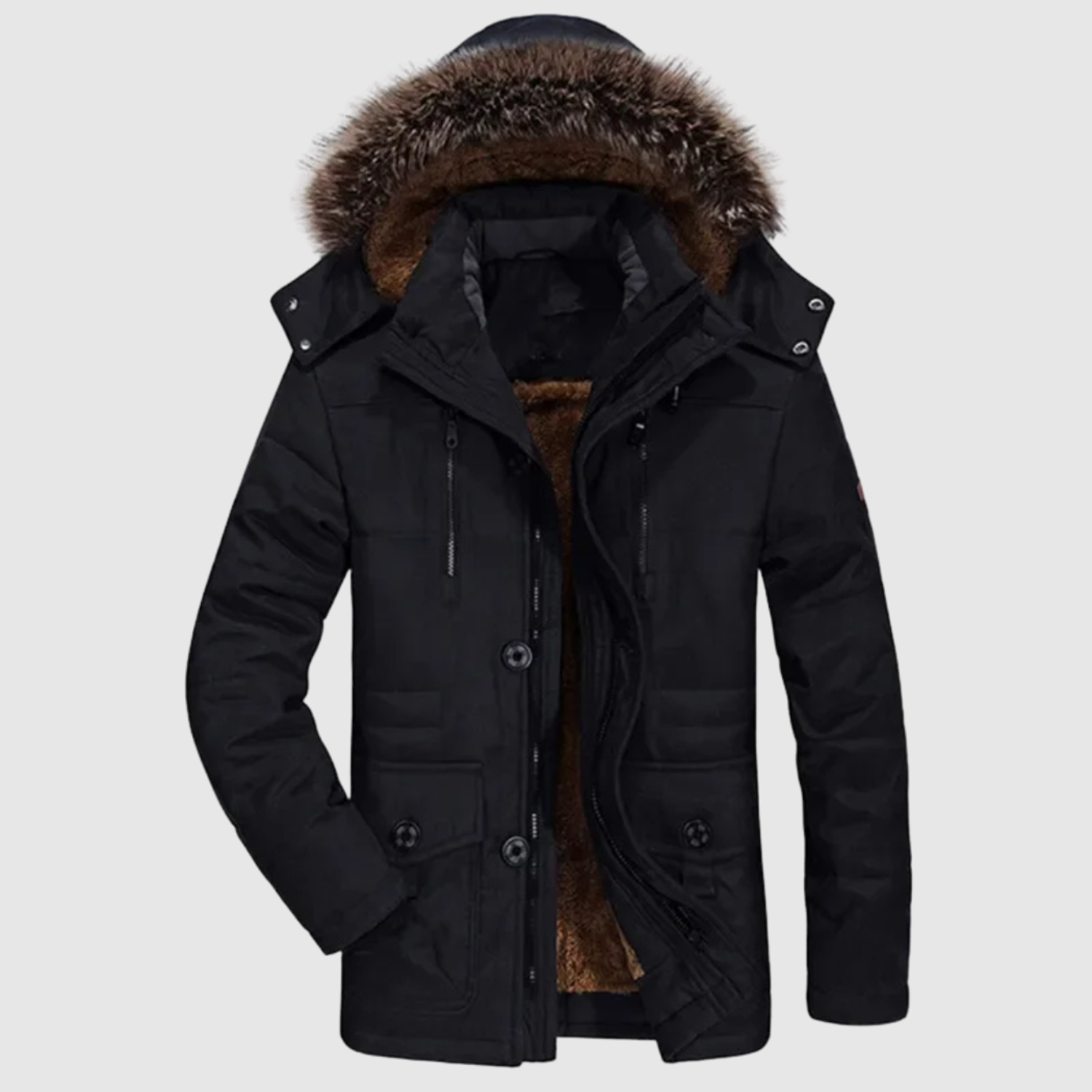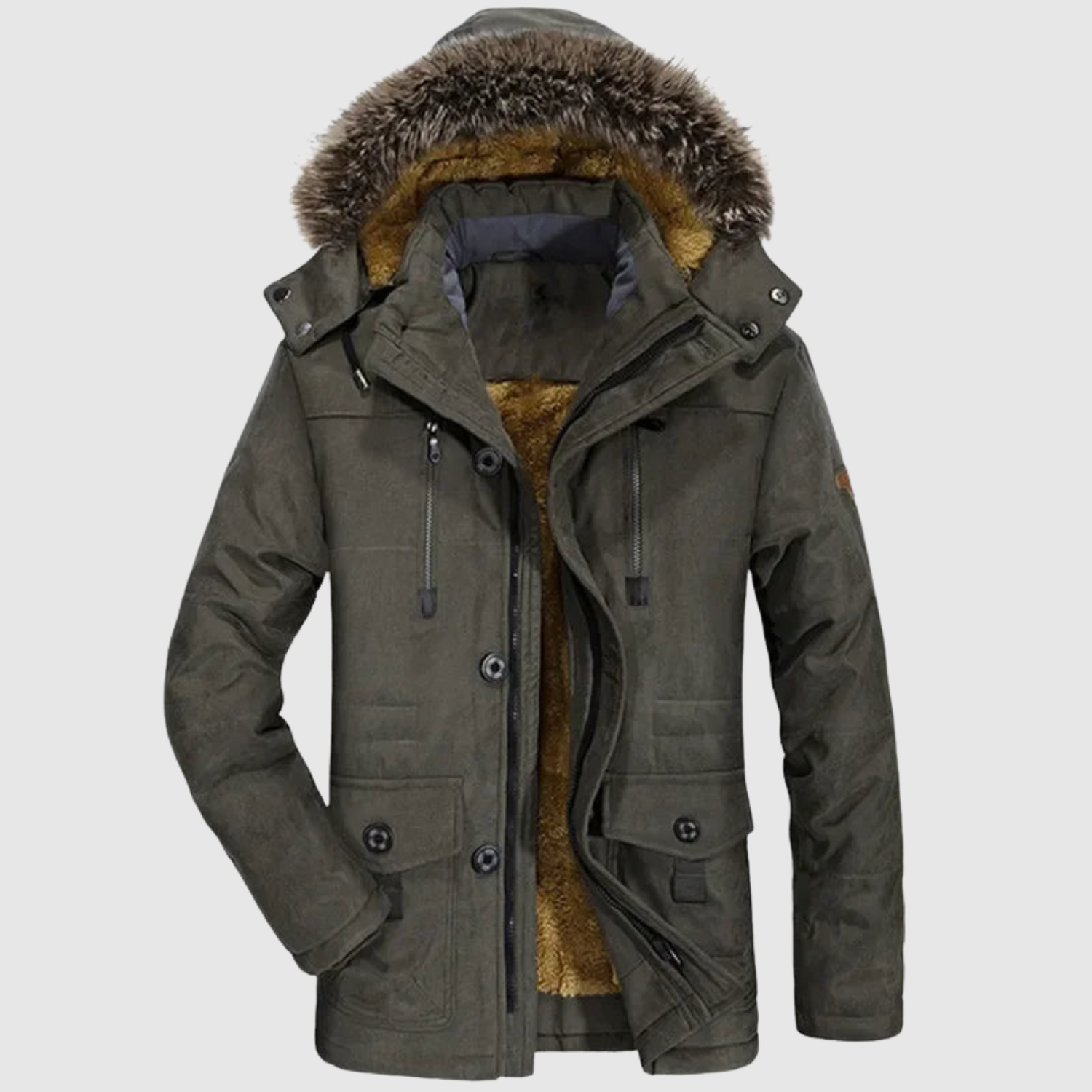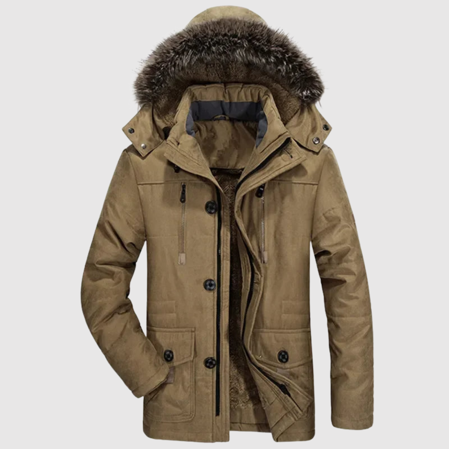 Ta kurtka łączy luksusowy wygląd z praktycznym ciepłem. Puchowy kaptur zapewnia ochronę przed zimnem i wiatrem, podczas gdy wytrzymały materiał utrzymuje komfort nawet w najniższych temperaturach. Odpowiednia zarówno na co dzień, jak i na bardziej eleganckie okazje.