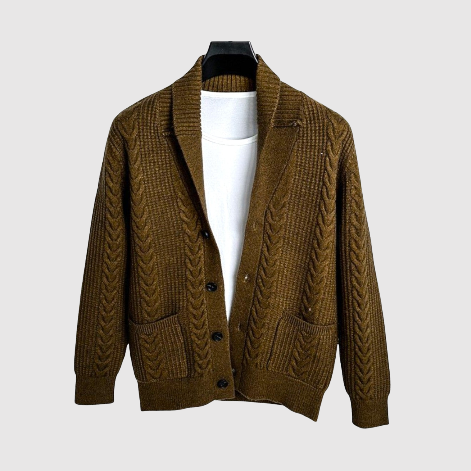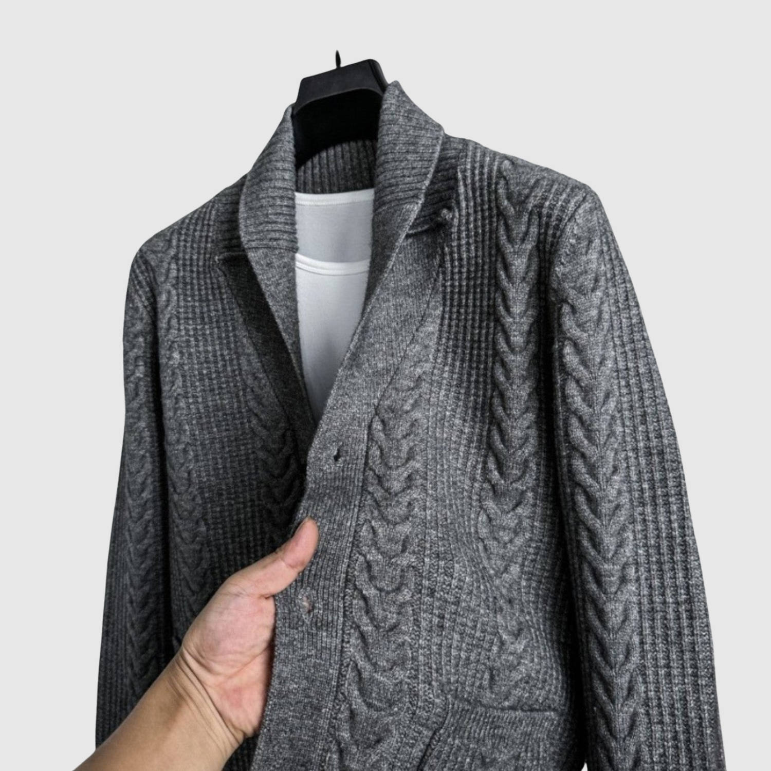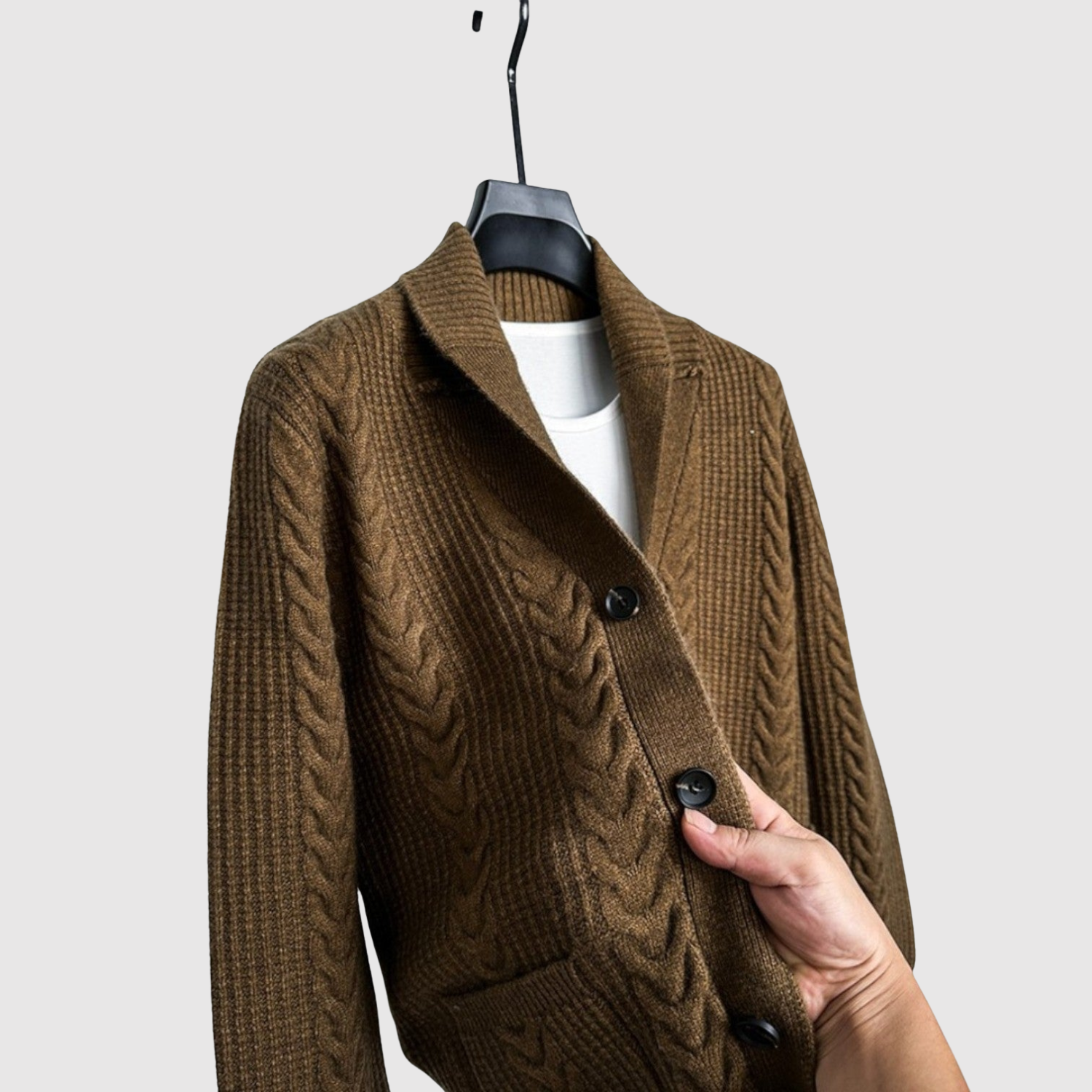 Ten kardigan z rybim splotem i rewersem to stylowy dodatek do Twojej garderoby. Prosta, ale elegancka sylwetka nadaje wyrafinowany wygląd, idealny zarówno do pracy, jak i na czas wolny. Uniwersalny wybór, który łączy komfort z klasą.
