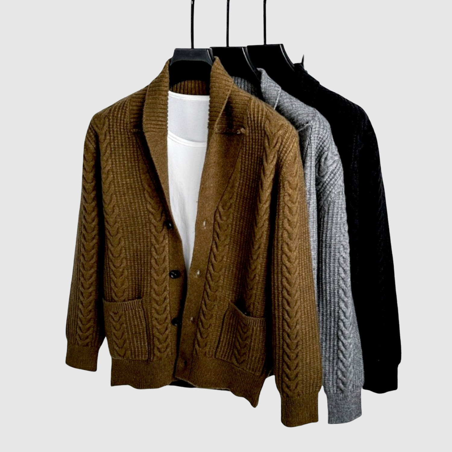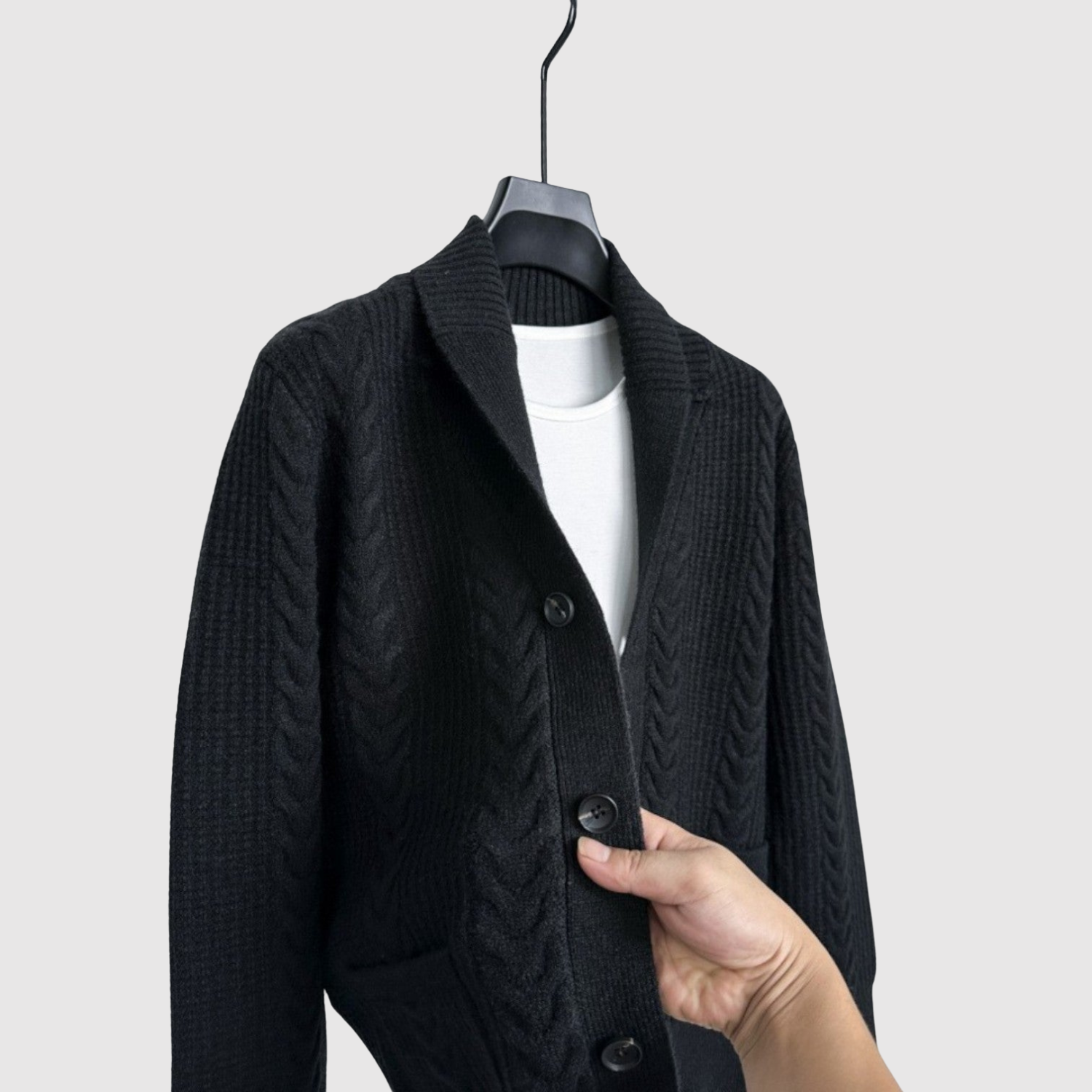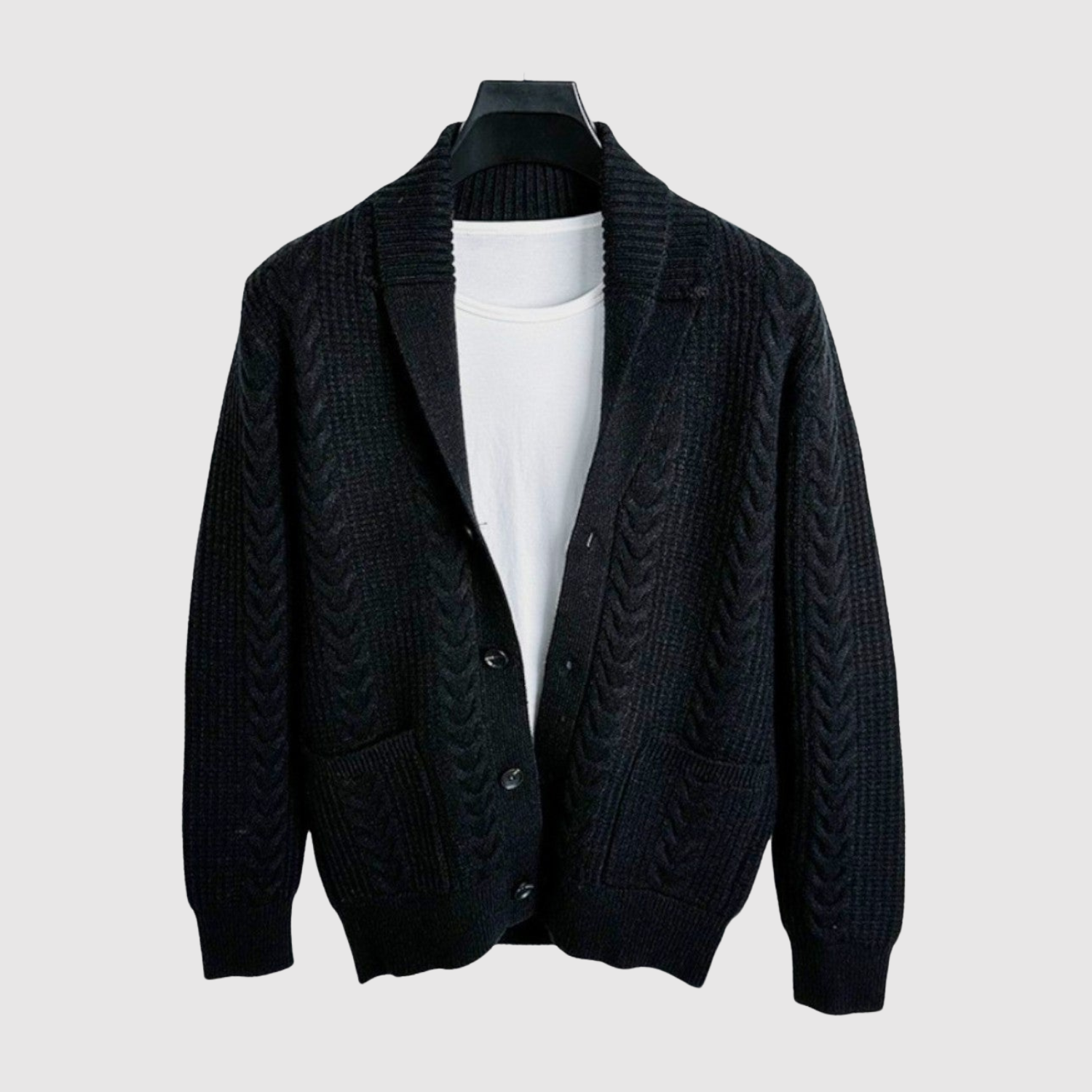 Ten kardigan z rybim splotem i rewersem to stylowy dodatek do Twojej garderoby. Prosta, ale elegancka sylwetka nadaje wyrafinowany wygląd, idealny zarówno do pracy, jak i na czas wolny. Uniwersalny wybór, który łączy komfort z klasą.