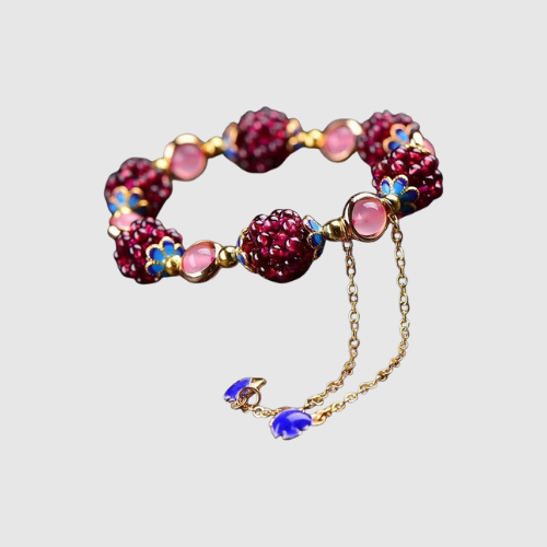 Ta bransoletka zachwyca swoją ręcznie wykonaną kombinacją czerwonych koralików, delikatnych niebieskich akcentów i złotego wykończenia. Emanuje energią, indywidualnością i wyjątkowym urokiem.