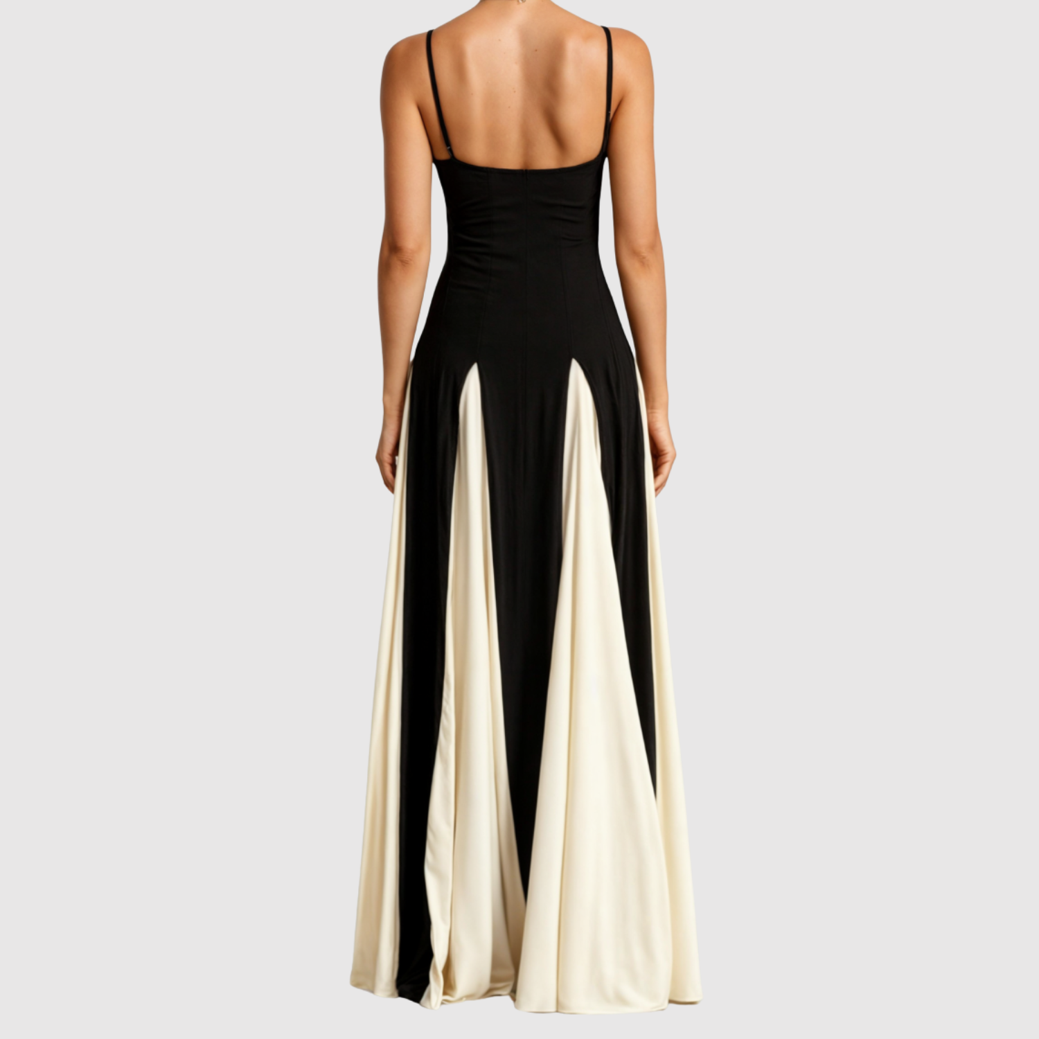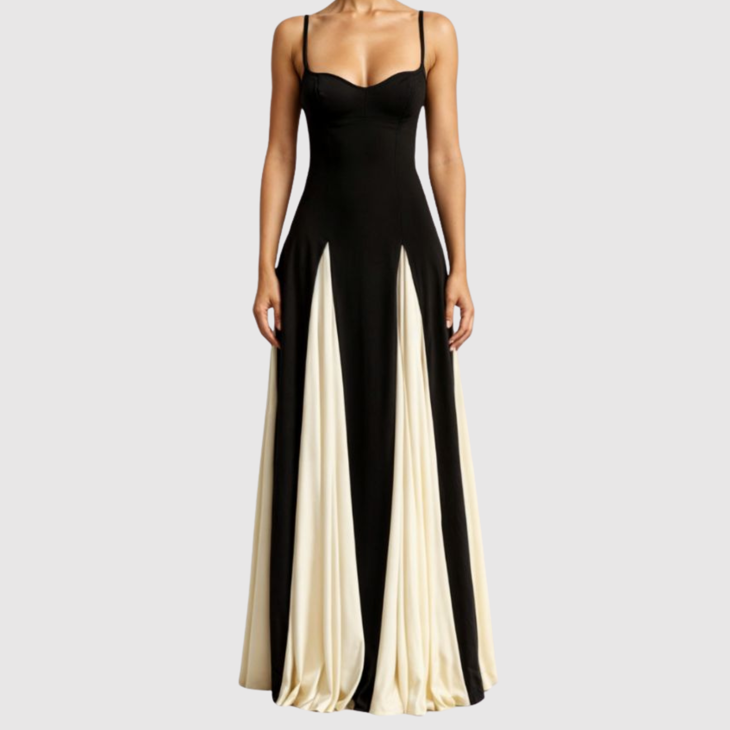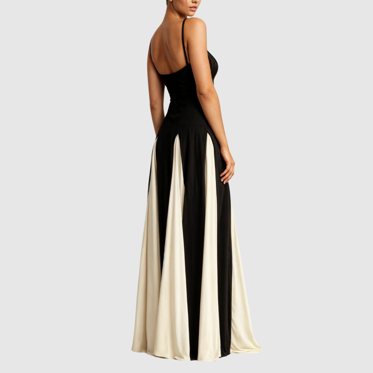 Ta sukienka łączy czarno-biały kontrast z długą, efektowną sylwetką, która pięknie opada przy każdym kroku. Delikatne ramiączka i eleganckie linie podkreślają sylwetkę, podczas gdy dwukolorowa spódnica tworzy luksusową obecność. Nadaje się na oficjalne wydarzenia, kolacje i szczególne okazje.