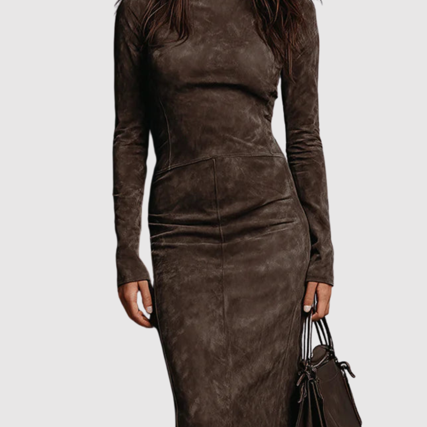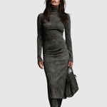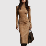 Ta dopasowana sukienka podkreśla sylwetkę, zapewniając jednocześnie wygodę i elegancję. Miękki materiał układa się naturalnie na ciele, a stonowane kolory nadają jej ponadczasowy charakter. Idealna na jesień, zimę oraz eleganckie wyjścia.