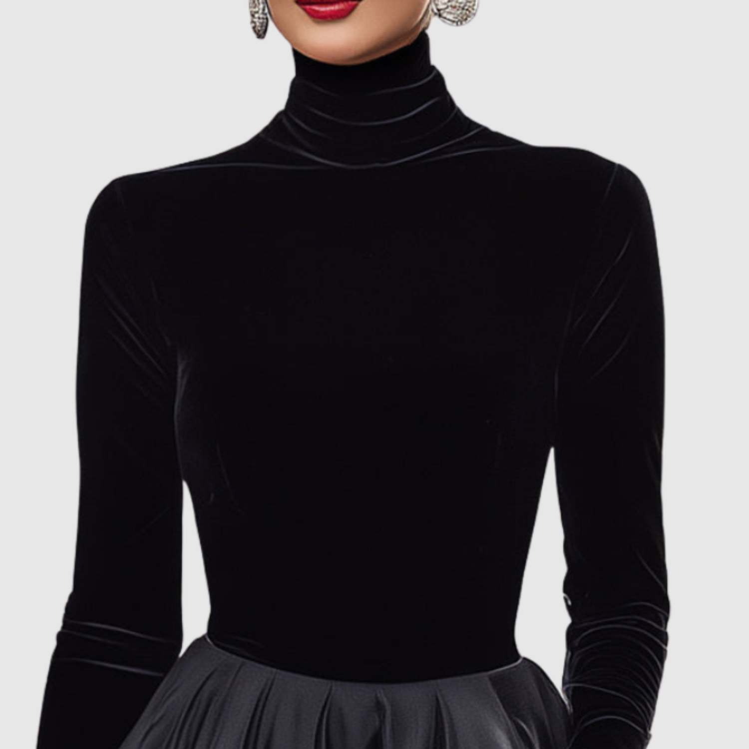 Ta sukienka łączy dopasowaną górę z wysokim kołnierzem i obszerną spódnicą o średniej długości, która tworzy piękny i imponujący ruch. Jest odpowiednia na oficjalne wydarzenia, przyjęcia i wieczorne okazje. Wygląda elegancko, nowocześnie i podkreśla naturalną grację.