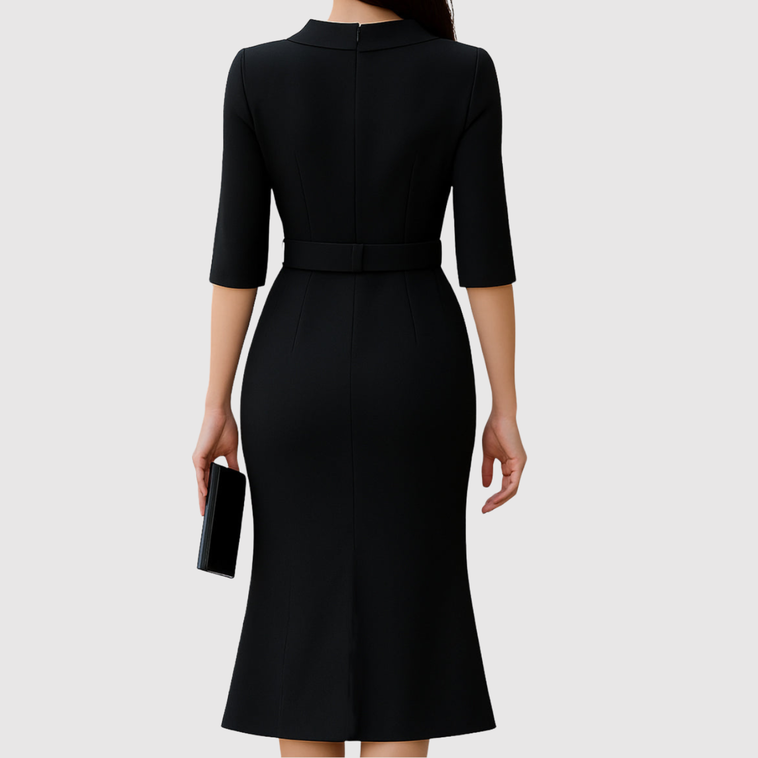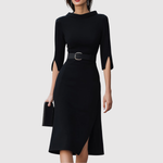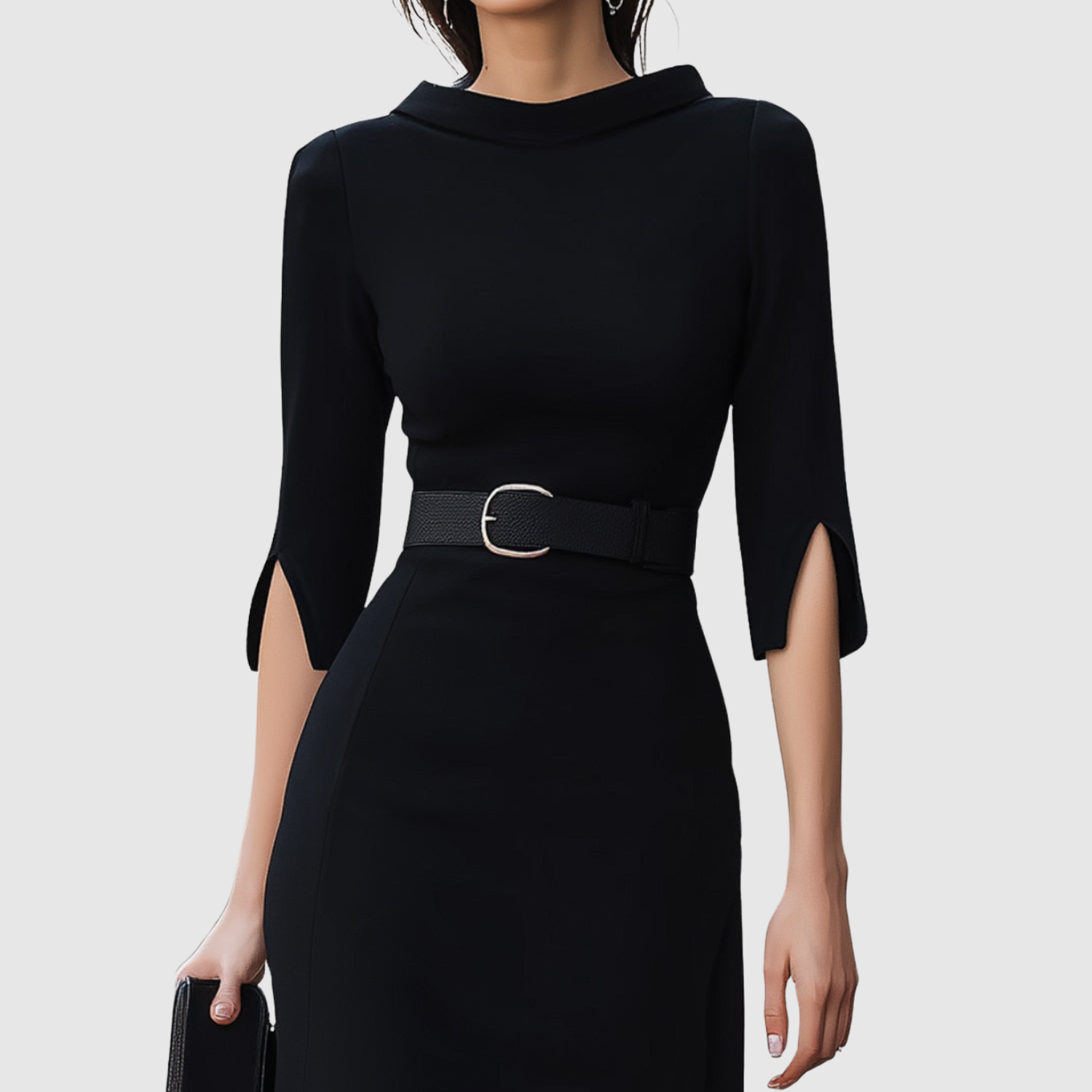Ta sukienka łączy dopasowaną sylwetkę, wysoki kołnierz i delikatny pasek, który podkreśla talię. Czysta linia i rozporek z przodu dodają nowoczesnej elegancji, odpowiedniej do pracy, spotkań lub wieczornych okazji. Wygląda kobieco, elegancko i zawsze robi wrażenie.