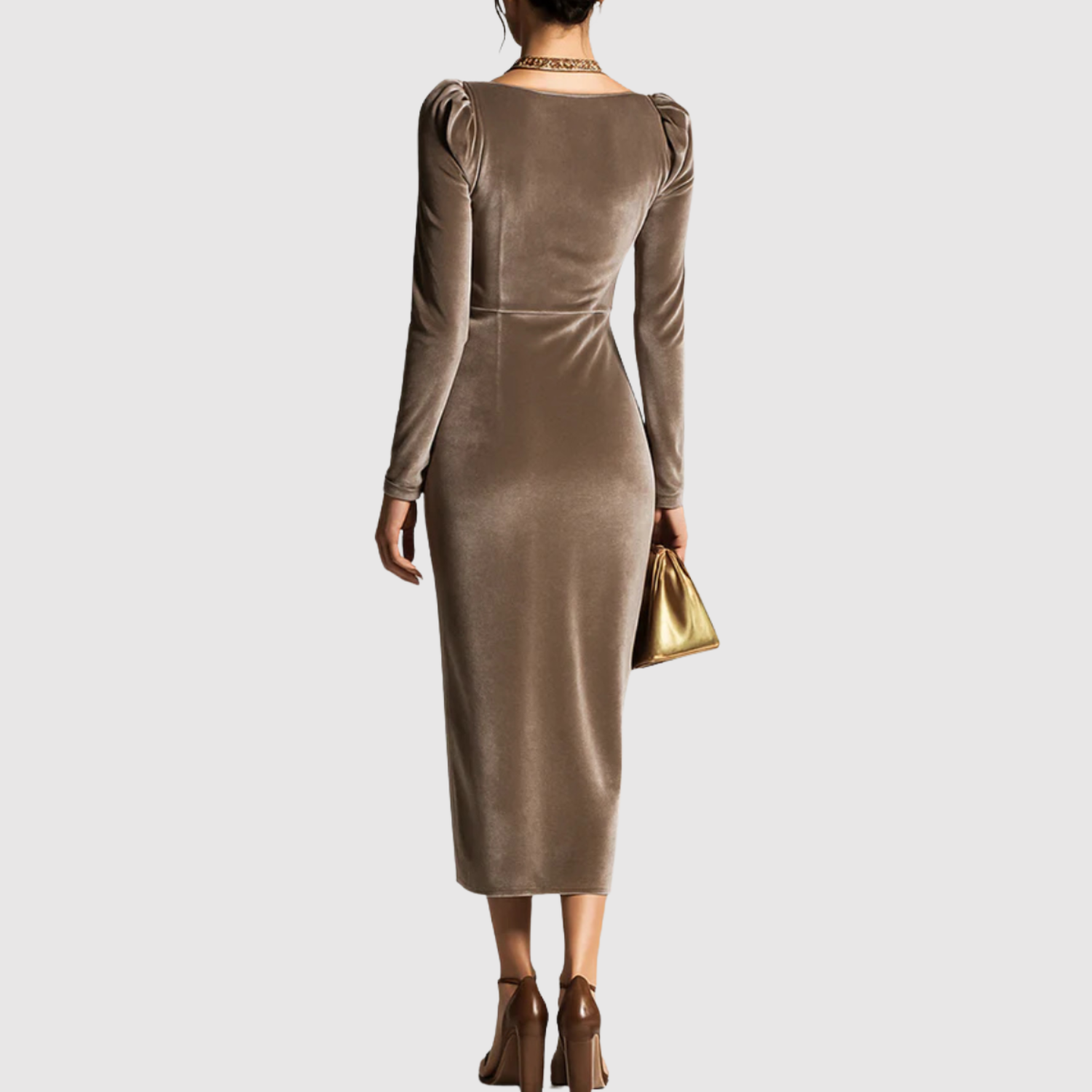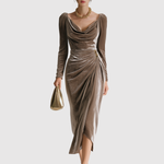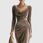 Ta welurowa sukienka zachwyca subtelnym blaskiem, delikatnymi draperiami i sylwetką, która podkreśla kobiecość. Idealna na specjalne okazje, wieczory lub uroczystości. Wygodna, elegancka i zaprojektowana tak, aby się wyróżniać.