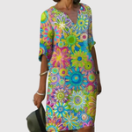 Lekkie i wygodne letnie sukienki z kolorowymi nadrukami, które emanują radością i energią. Idealne na wyjazdy na plażę, wakacje lub spokojne letnie dni. Tkanina jest oddychająca, co czyni je idealnymi na słoneczne dni.