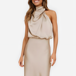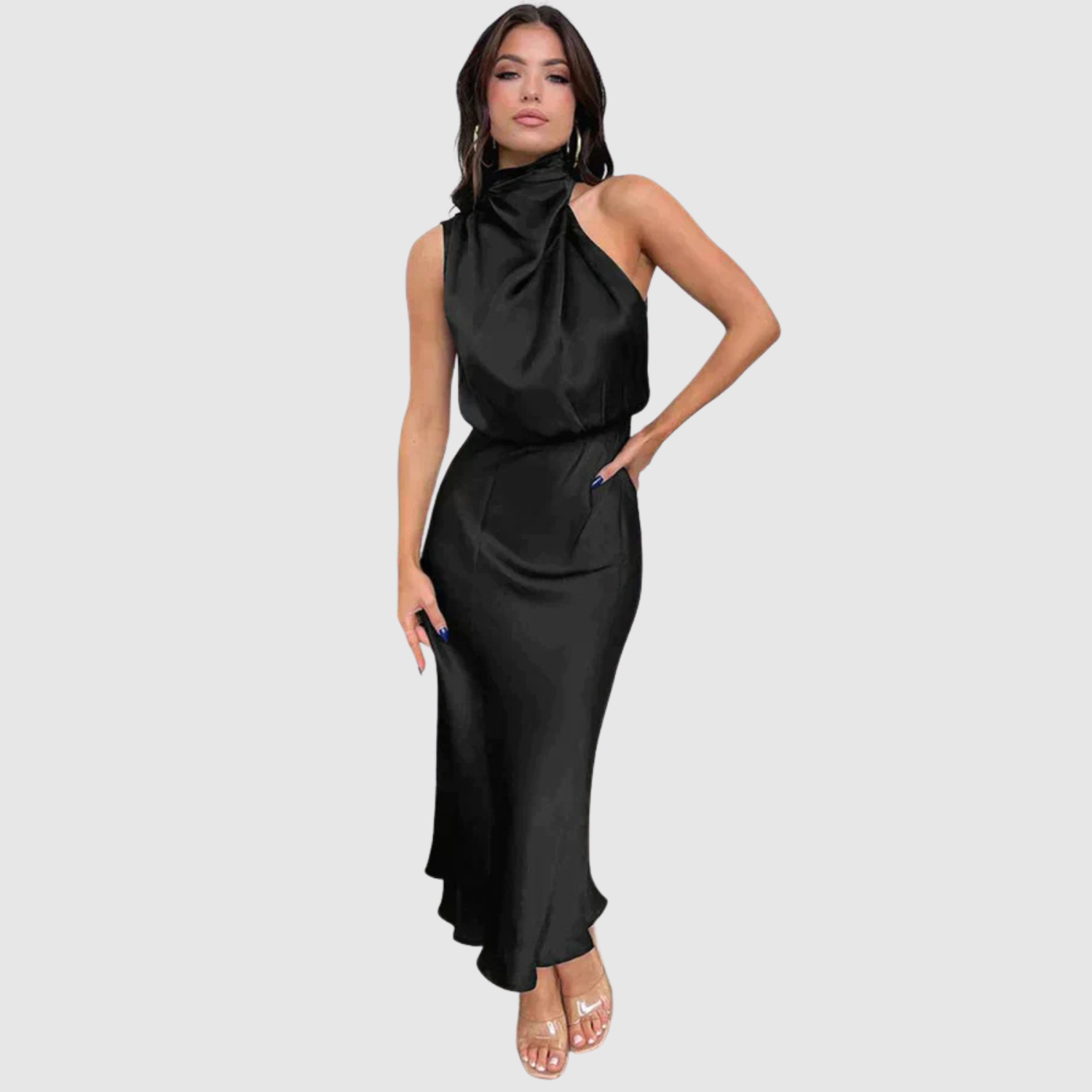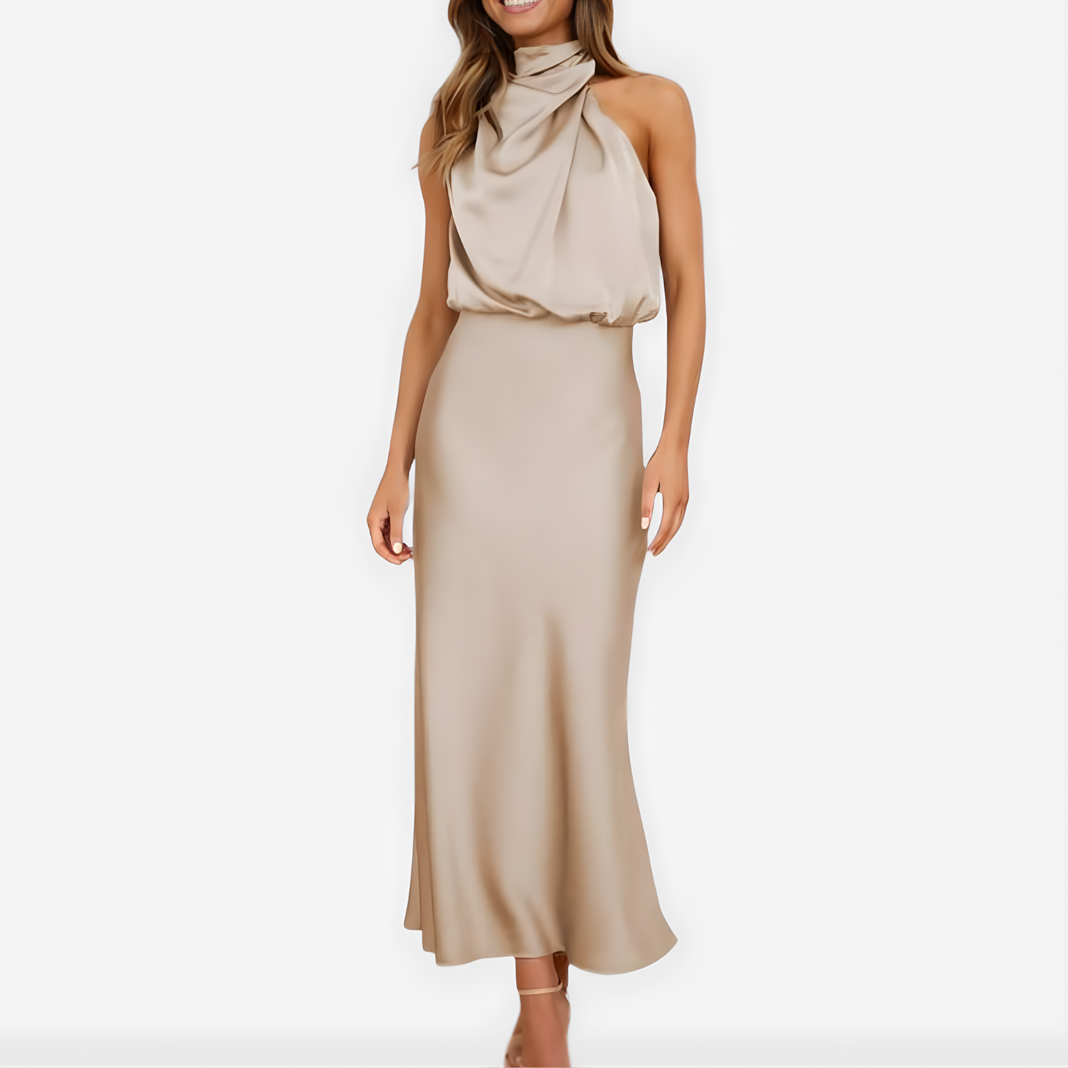 Ponadczasowa maxi sukienka z miękkiej satyny z wysokim kołnierzem i kobiecą sylwetką, która nadaje delikatny i błyszczący wygląd. Idealna na wieczory, gdy chcesz zabłysnąć stylem.
