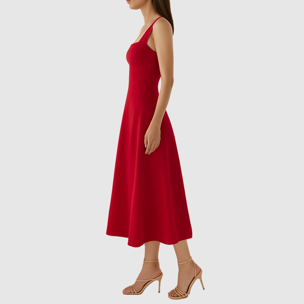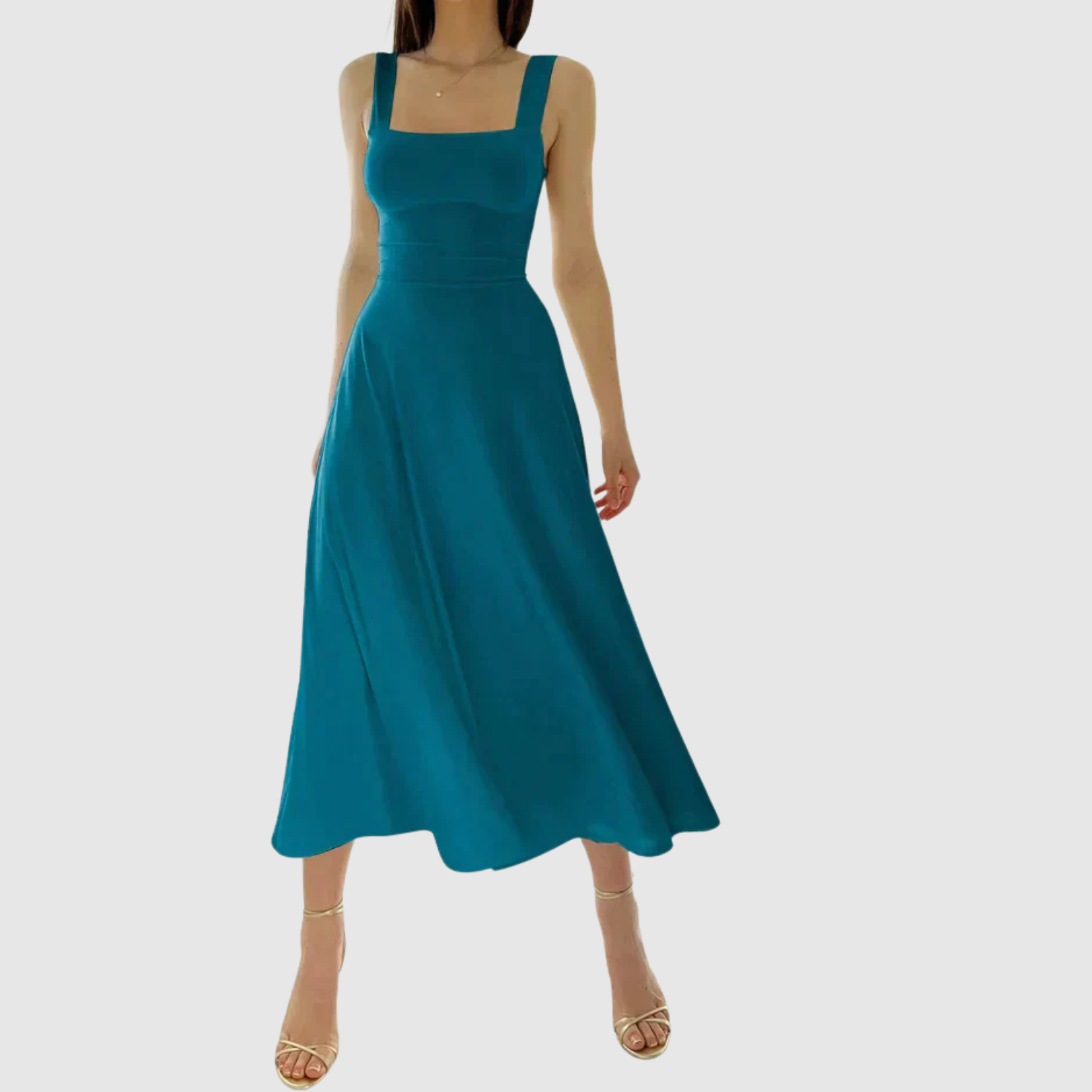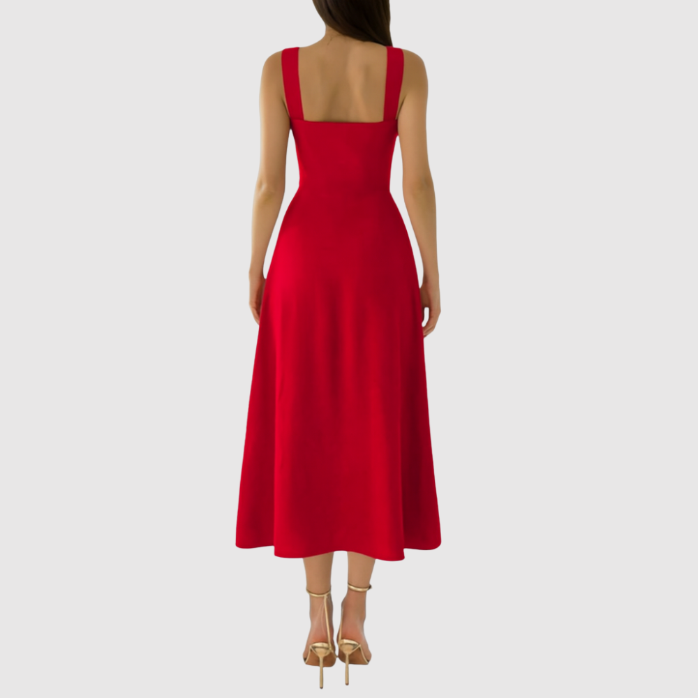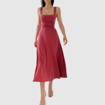 Ponadczasowa midi sukienka z kwadratowym dekoltem i szerokimi ramiączkami, które nadają kobiecy i wyrafinowany wygląd. Płynna sylwetka A tworzy ruch i komfort, idealna na letnie dni, wesela lub eleganckie wieczory.