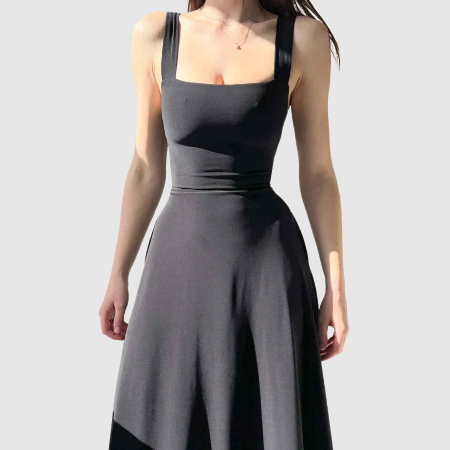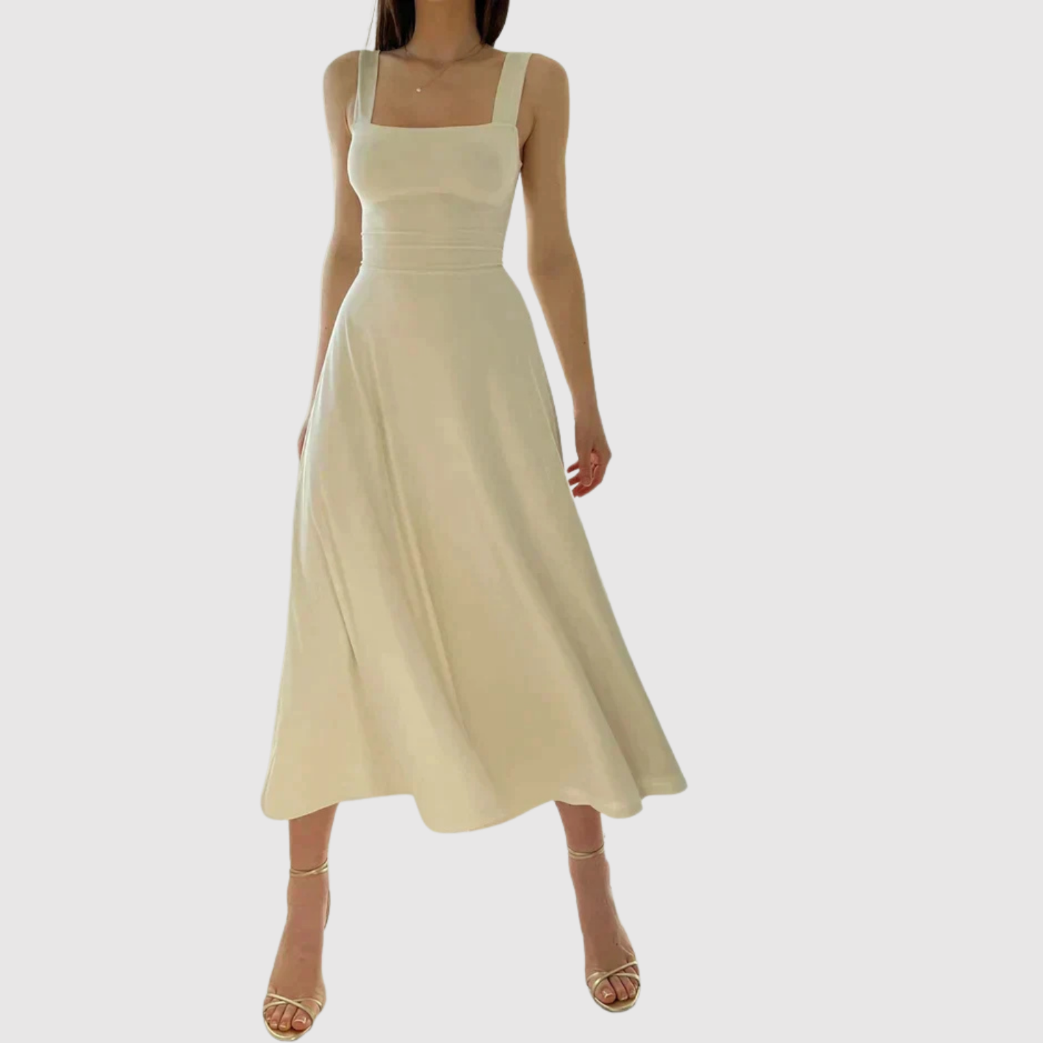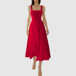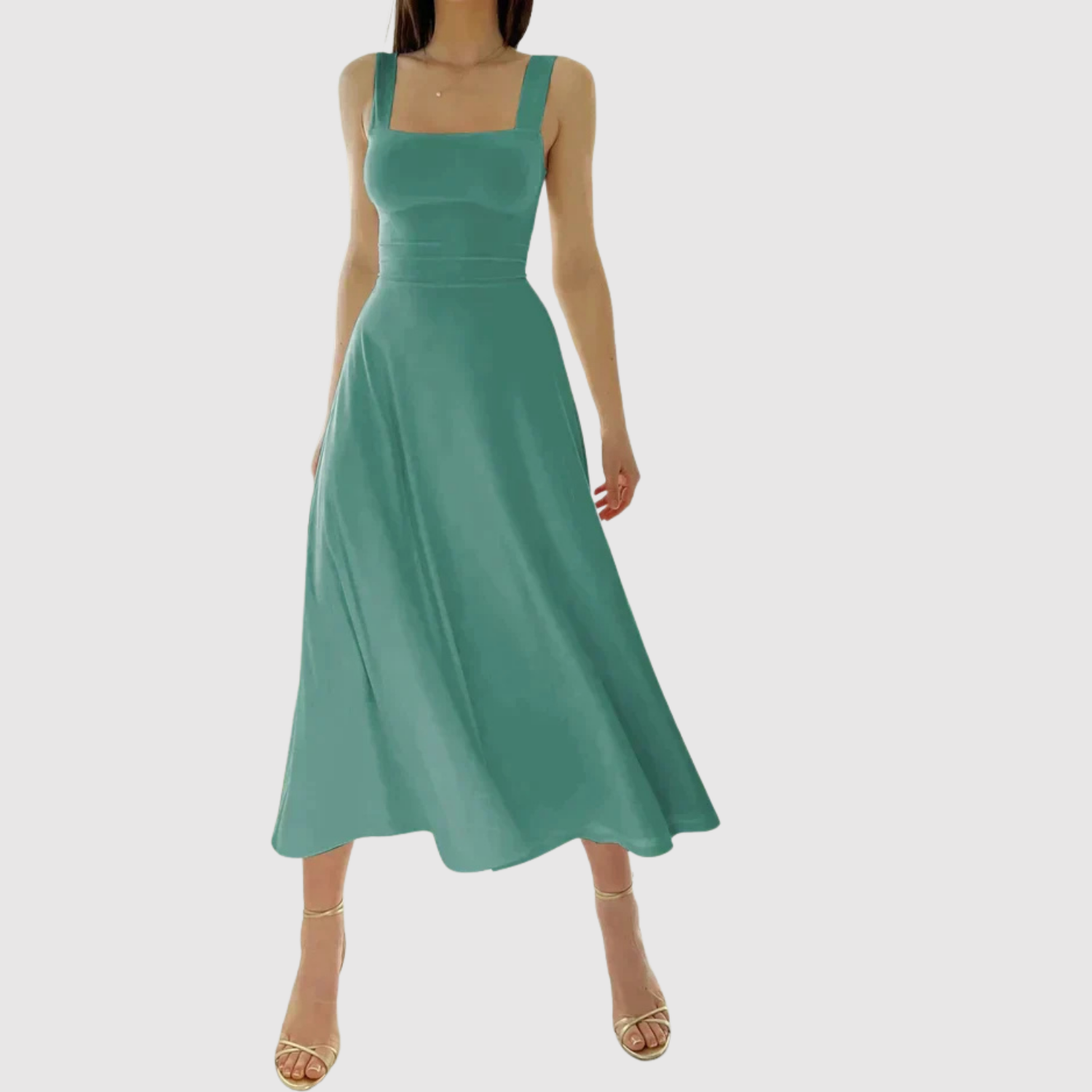 Ponadczasowa midi sukienka z kwadratowym dekoltem i szerokimi ramiączkami, które nadają kobiecy i wyrafinowany wygląd. Płynna sylwetka A tworzy ruch i komfort, idealna na letnie dni, wesela lub eleganckie wieczory.