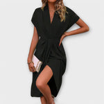 Ta midi sukienka z wiązaniem łączy nowoczesną elegancję z korzystnym krojem, który bez wysiłku podkreśla sylwetkę. Dopasowany fason i delikatnie drapowana przednia część sprawiają, że jest to doskonały wybór na specjalne okazje, kolacje lub dni, kiedy chcesz wyglądać elegancko, nie rezygnując z wygody.