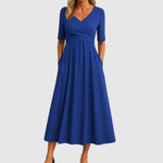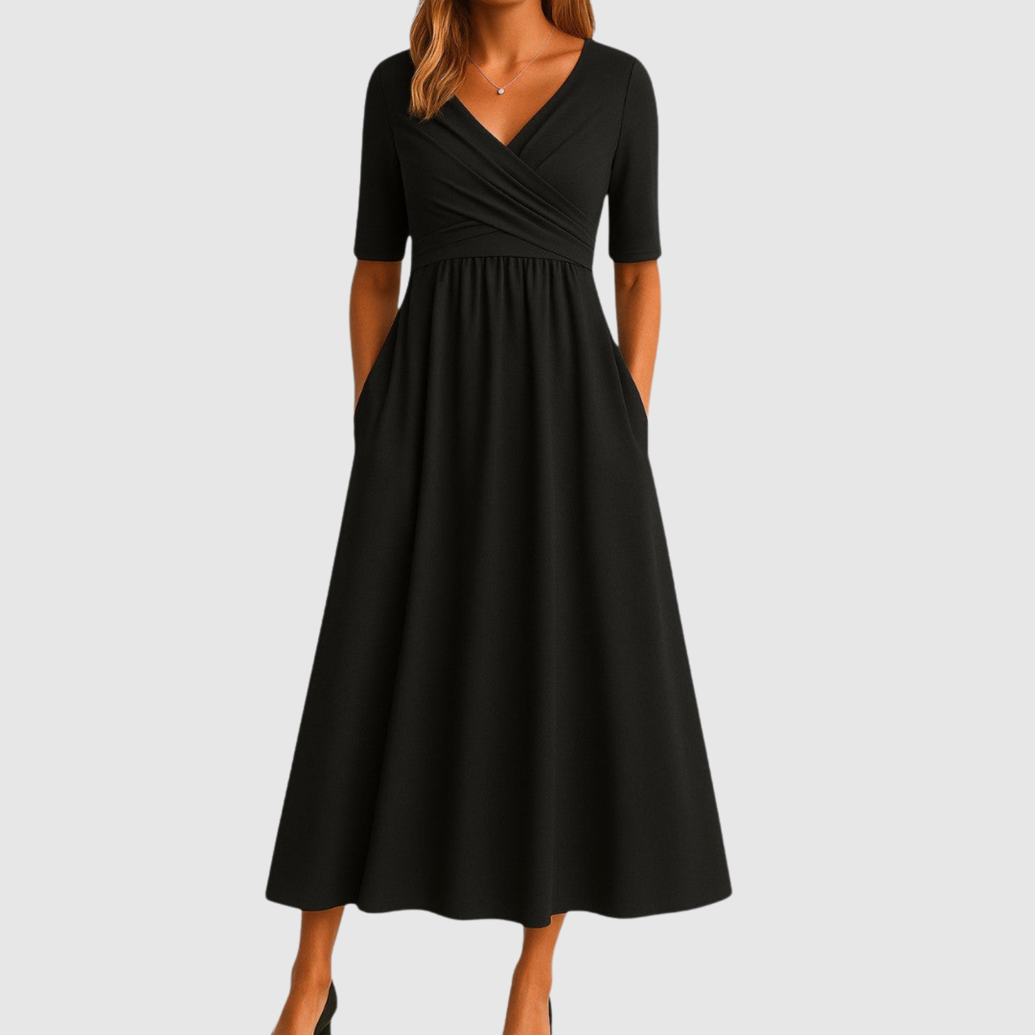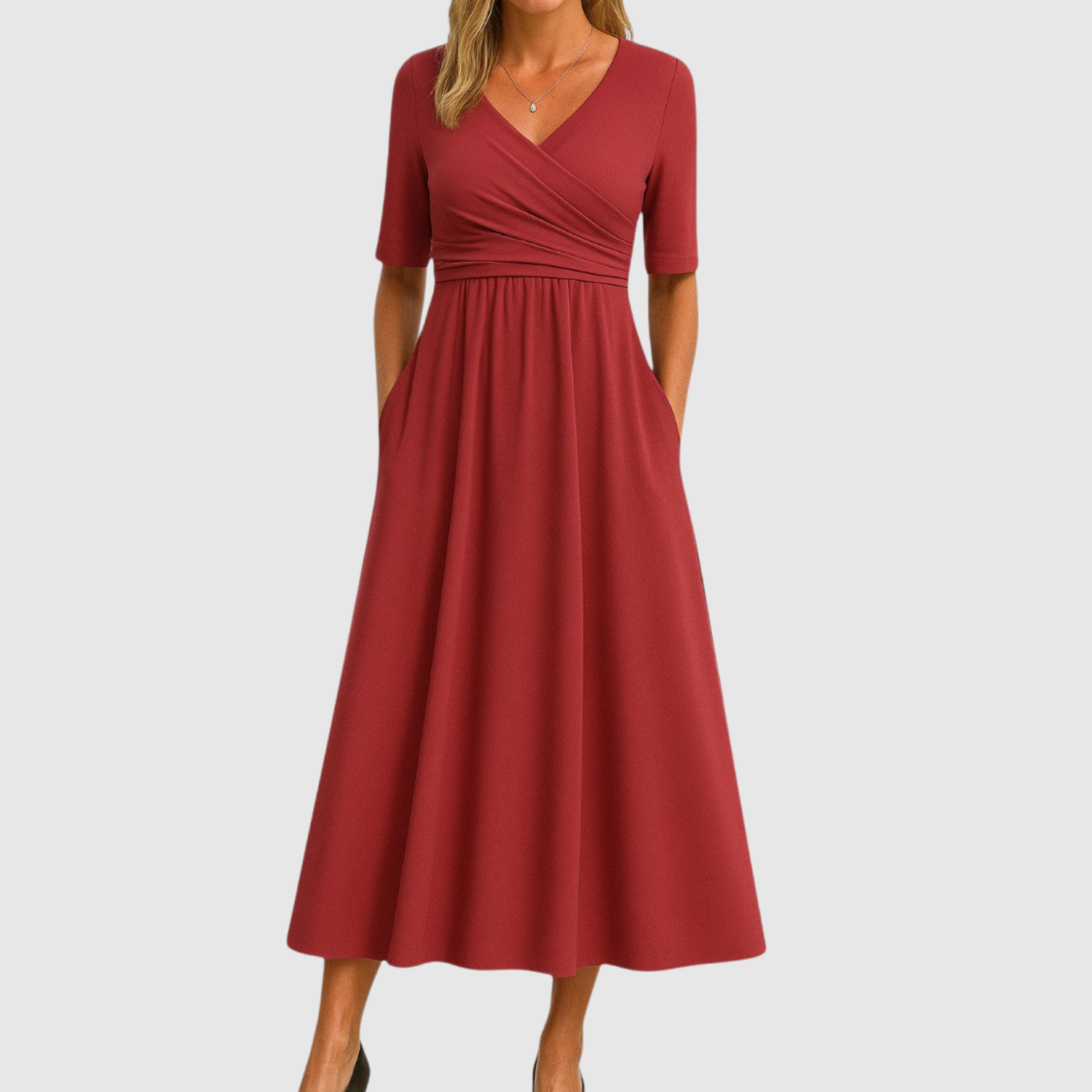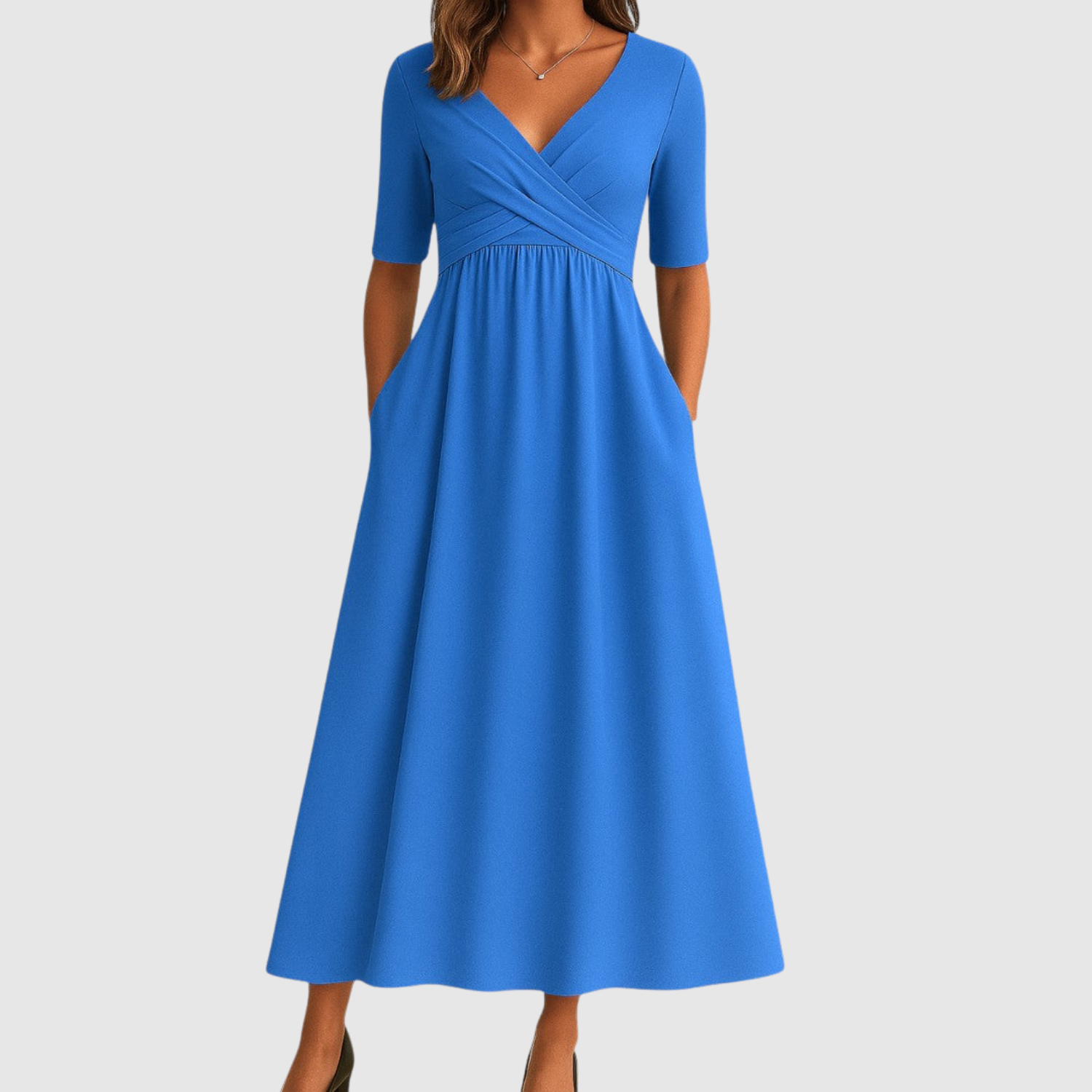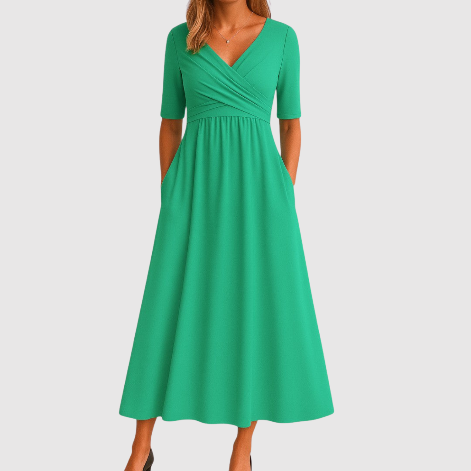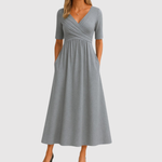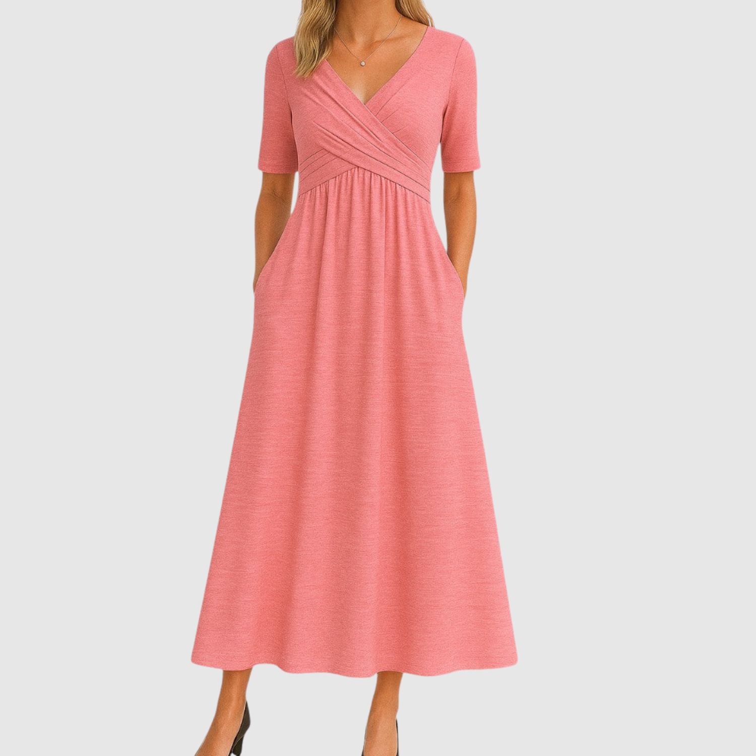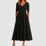 Ta sukienka oferuje lekkość, ruch i uniwersalną linię, która wygląda pięknie na każdej sylwetce. Zawinięty dekolt dodaje kobiecego akcentu, podczas gdy rozszerzona dolna część zapewnia komfort przez cały dzień. Idealna na codzienne spacery i nieformalne okazje.