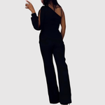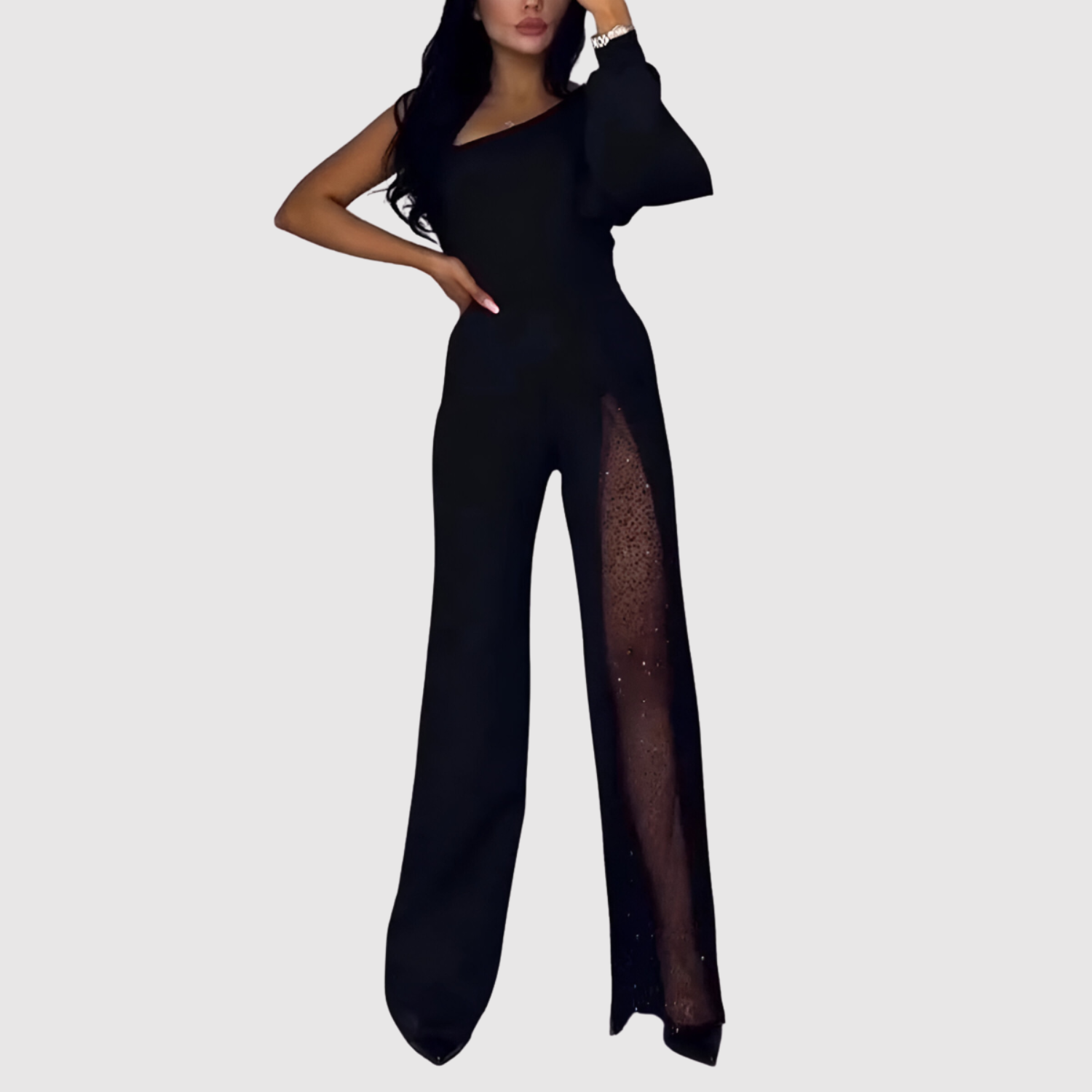 Elegancki kombinezon zaprojektowany na wieczorne wydarzenia i specjalne okazje. Łączy korzystny krój z delikatnymi koronkowymi panelami, które stylowo podkreślają sylwetkę.