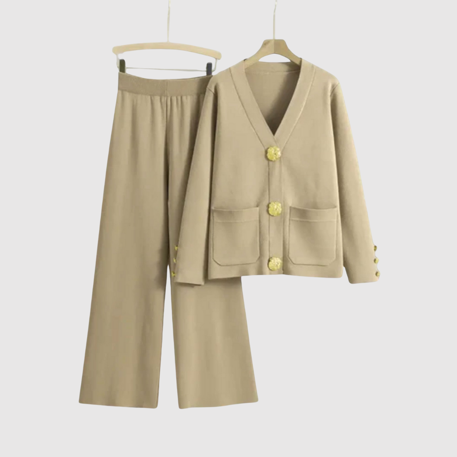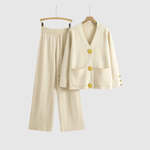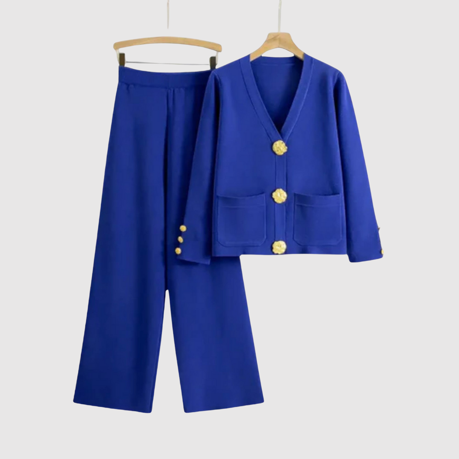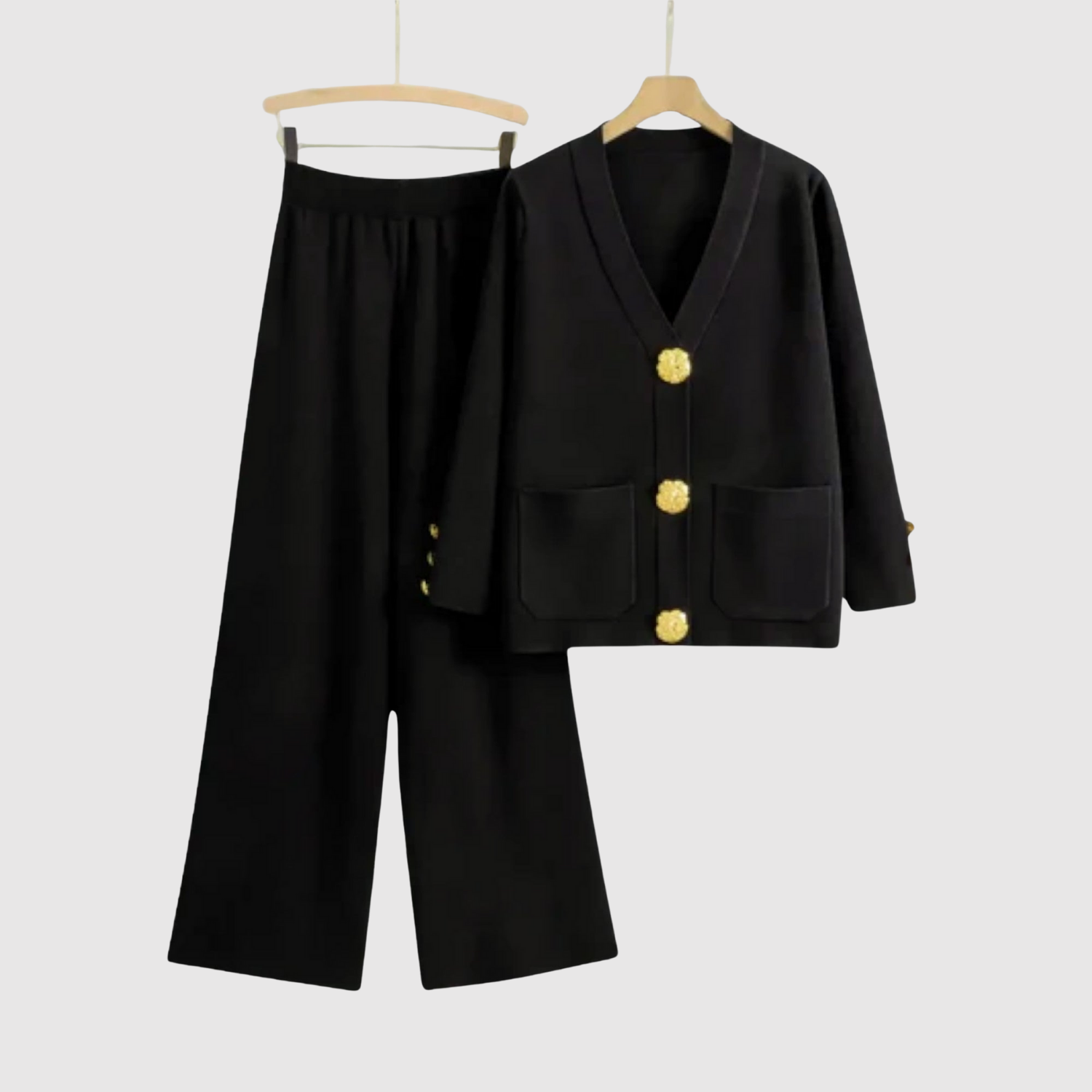 Ten kombinezon łączy minimalistyczny design z luksusowymi detalami. Wyraziste złote guziki dodają wysublimowanego akcentu, podczas gdy wygodny krój sprawia, że zestaw jest idealny zarówno do biura, jak i na kolacje na zewnątrz. Obowiązkowy element nowoczesnej garderoby.