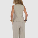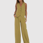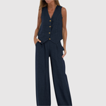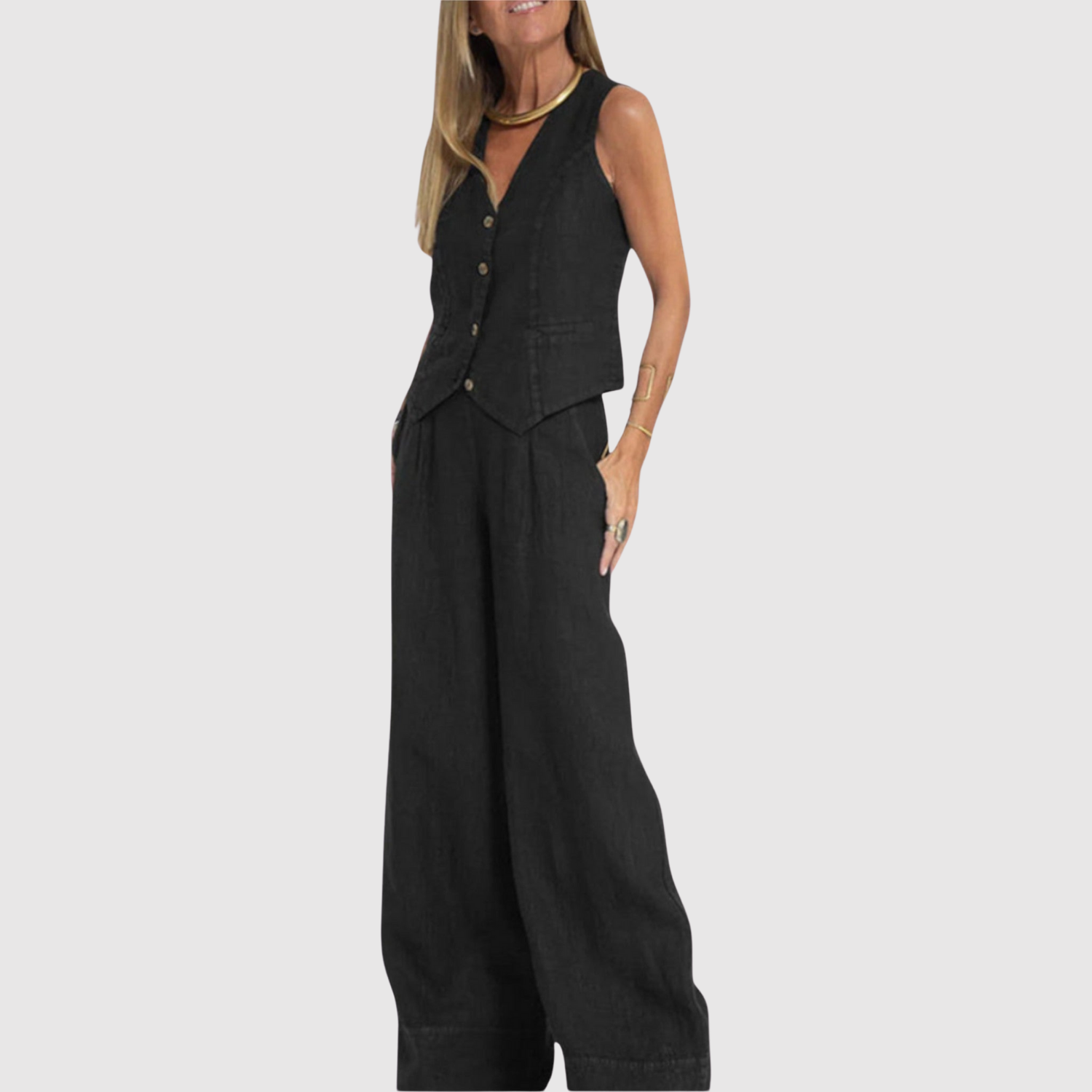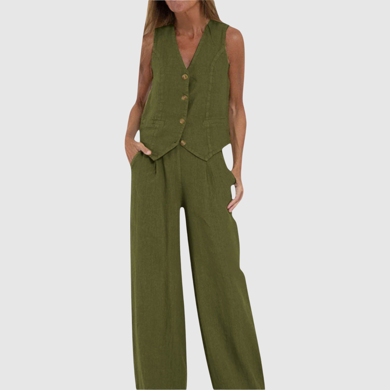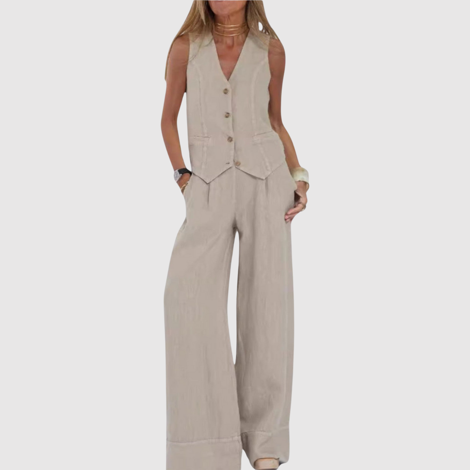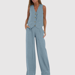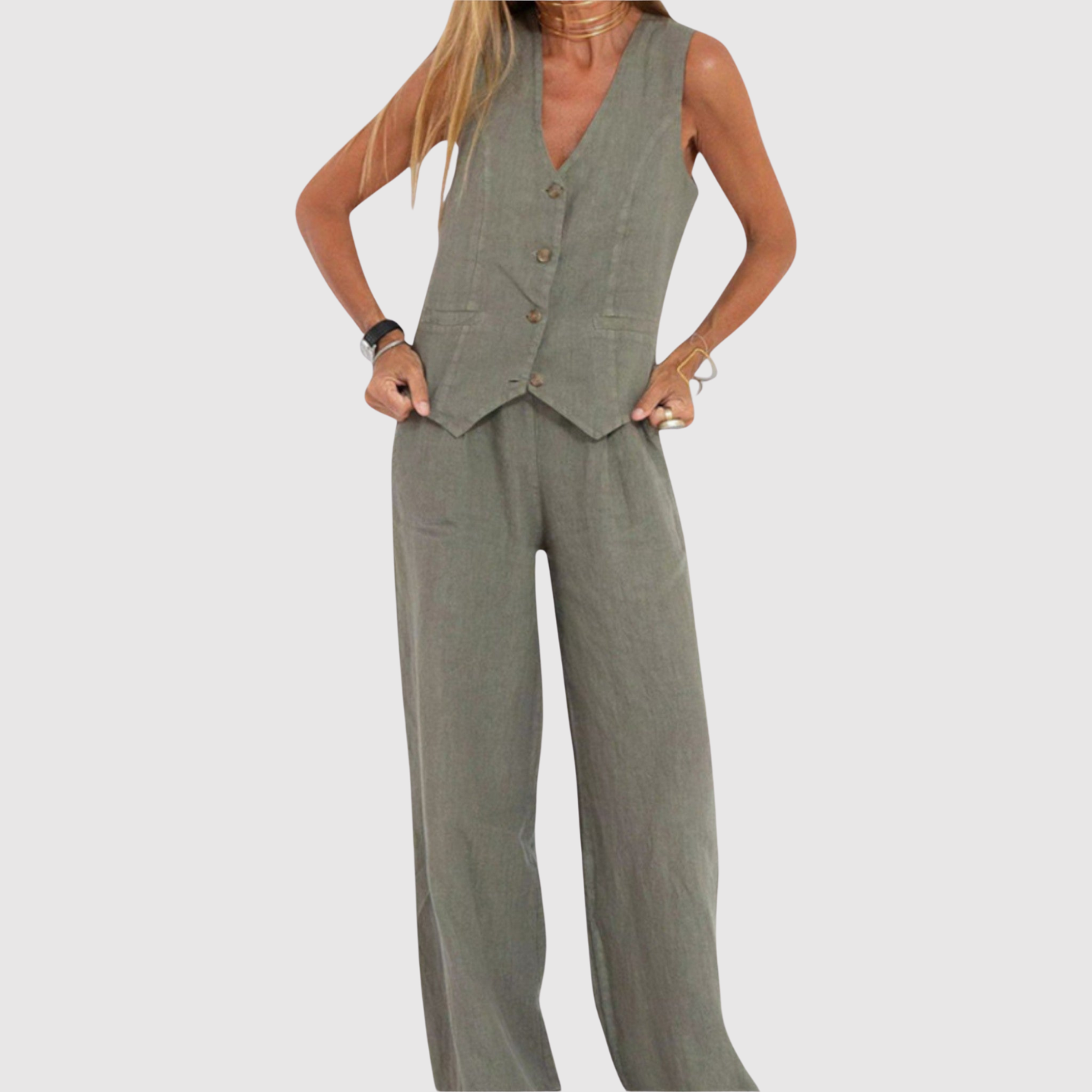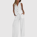Stylowy komplet z bezramiennym swetrem i dopasowanymi spodniami z lekkiego materiału. Idealny na gorące dni, kiedy komfort i styl idą w parze. Dzięki nowoczesnemu krojowi nadaje elegancki, ale swobodny wygląd.