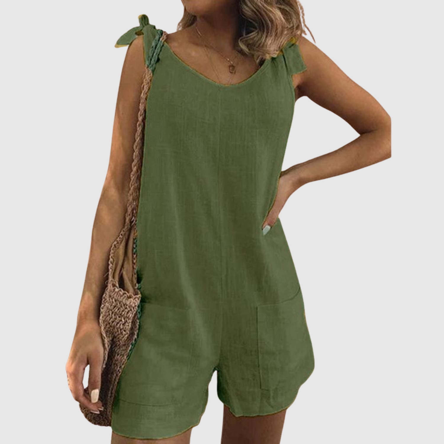 Przewiewny i prosty kombinezon, idealny na nieformalne letnie stylizacje. Zaprojektowany z wiązaniem na ramionach dla kobiecego akcentu i wykonany z lekkiego materiału, który zapewnia komfort i styl. Idealny na wakacje, plażowe wycieczki lub codzienne noszenie w ciepłe dni.