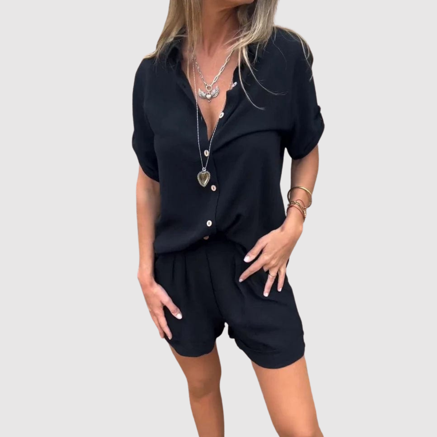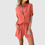 Lekki i przewiewny komplet, składający się z luźno stojącej koszuli i pasujących szortów. Zaprojektowany na gorące dni, kiedy komfort i styl idą w parze. Idealny zarówno na plażę, jak i na wieczorny spacer czy relaksujący dzień w domu.