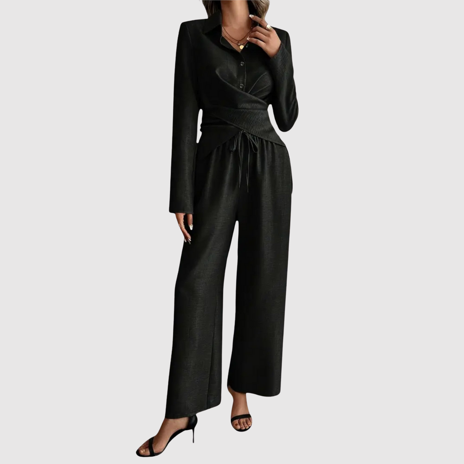 Natálie – Elegancki komplet z wiązaną bluzką i spodniami