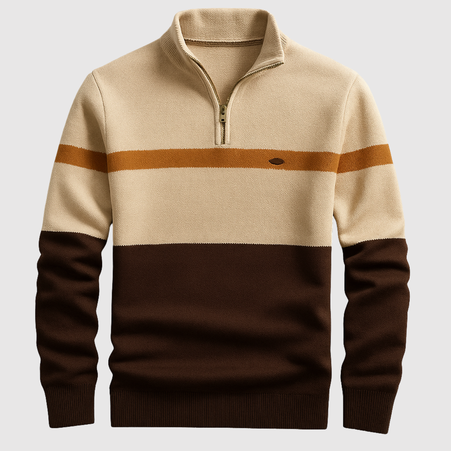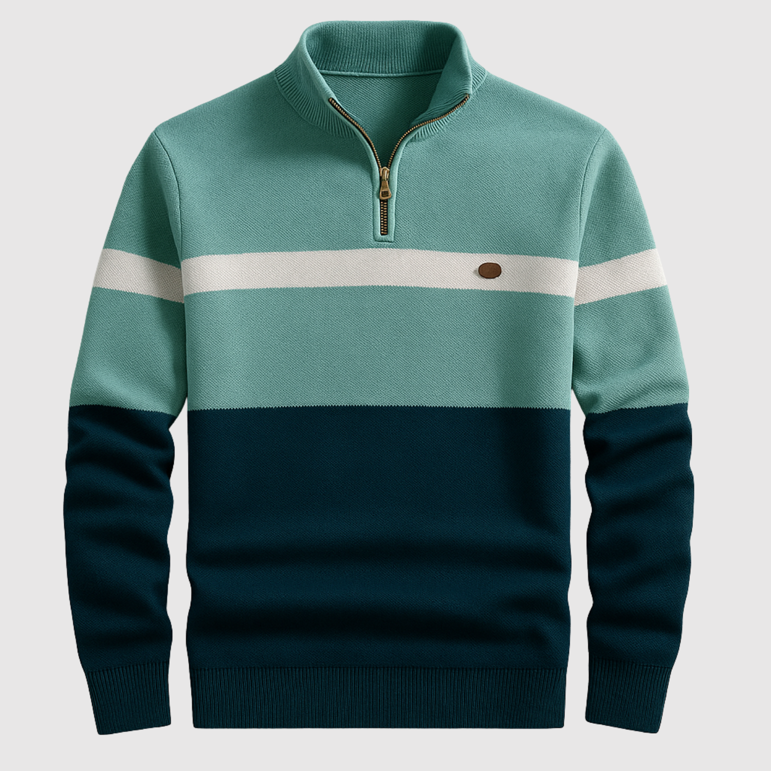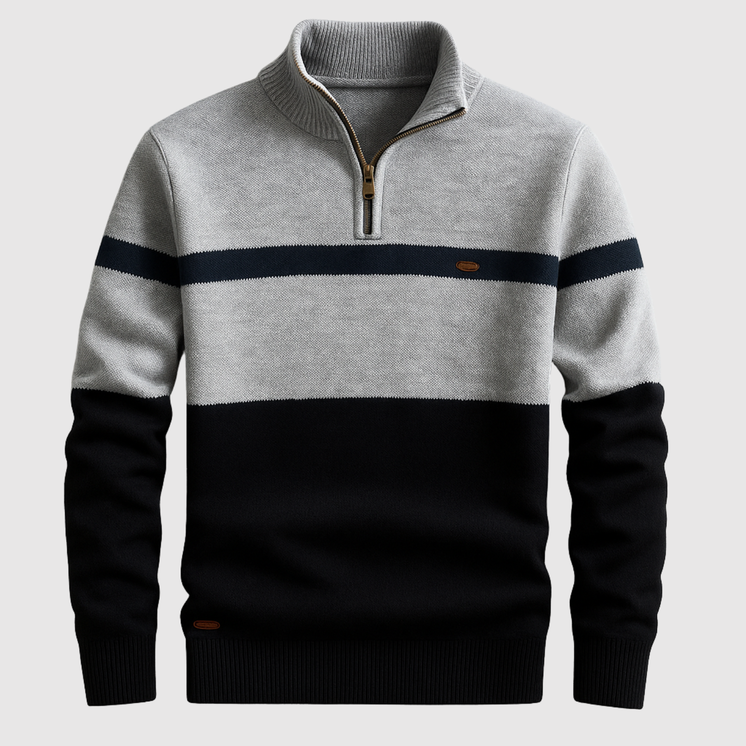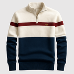 Ten męski sweter łączy elegancki styl z codzienną funkcjonalnością. Wykonany z miękkiego i ciepłego materiału, zapewnia komfort i swobodę ruchów. Kontrastowe kolorowe bloki i zamek błyskawiczny przy kołnierzu nadają nowoczesny wygląd, odpowiedni na każdą porę roku i okazję.