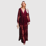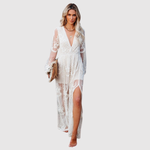 Piękna maxi sukienka z koronki z przezroczystymi detalami i głębokim dekoltem w kształcie V. Lekka, zwiewna i kobieca – idealna na letnie przyjęcia, plażowe wesela lub wieczory z eleganckim akcentem.