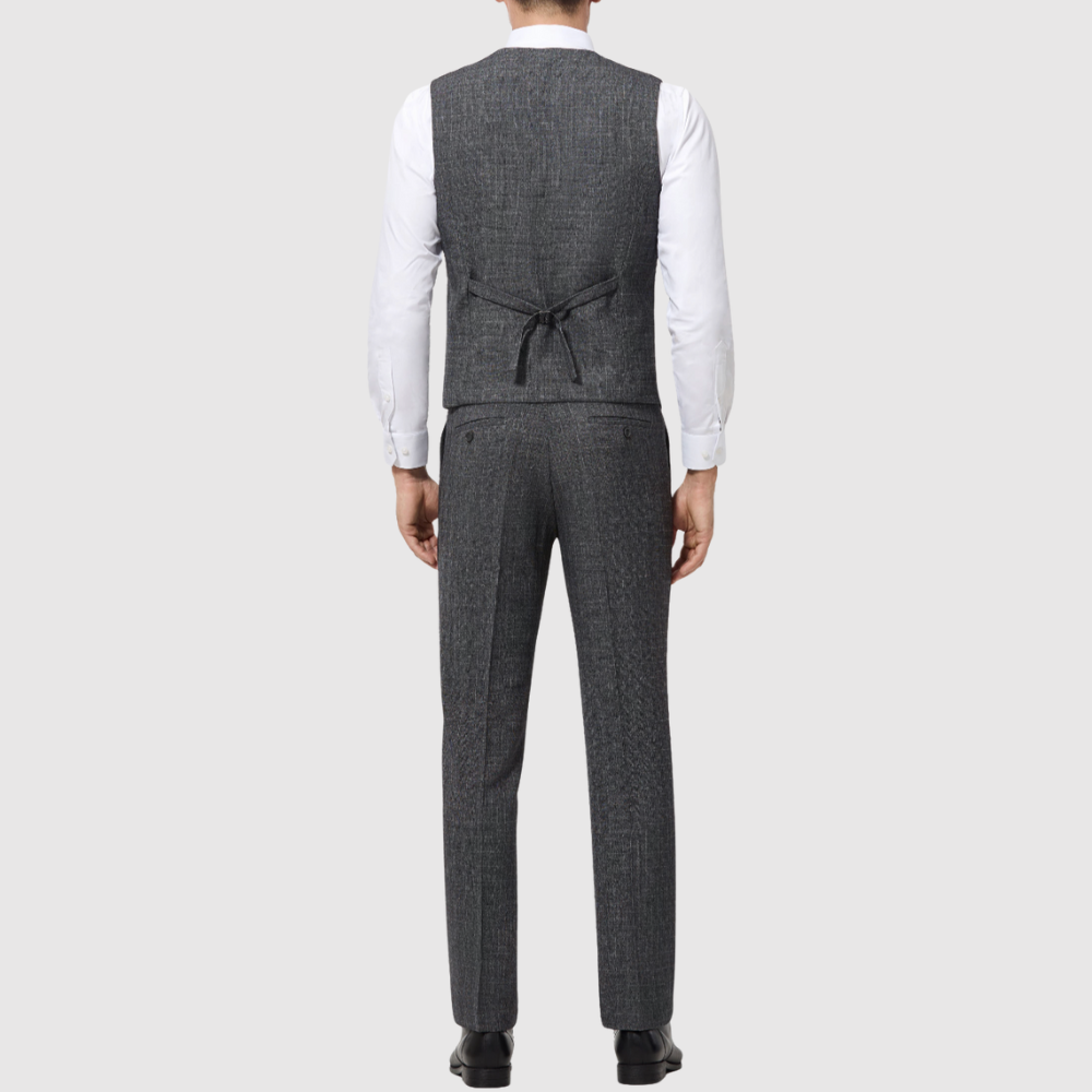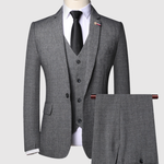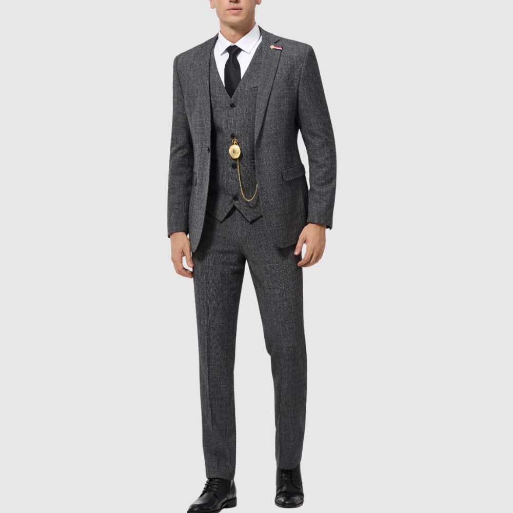 Ten męski garnitur trzyczęściowy to idealny wybór na uroczystości, spotkania biznesowe i oficjalne wydarzenia. Dopasowany krój oraz spójna stylistyka marynarki, kamizelki i spodni zapewniają elegancki i profesjonalny wygląd.