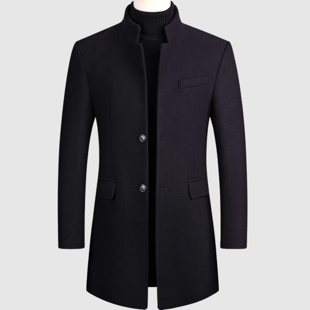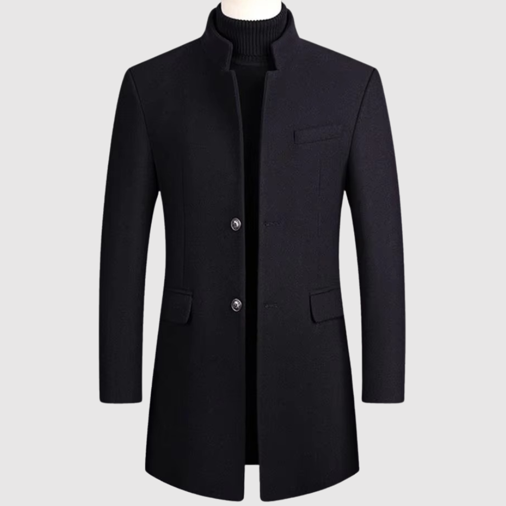 Ten męski płaszcz zimowy wyróżnia się minimalistycznym designem i eleganckim krojem. Wysoki kołnierz oraz prosta linia sprawiają, że doskonale sprawdzi się w codziennych oraz bardziej formalnych stylizacjach w sezonie zimowym.