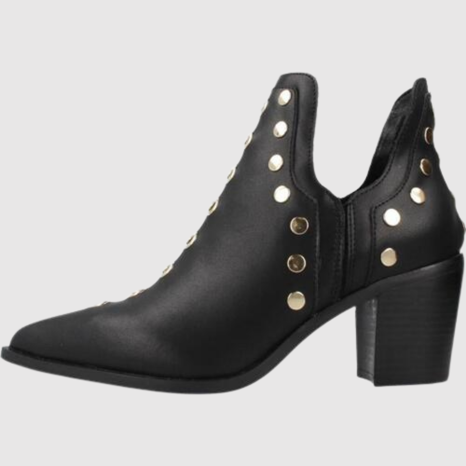 Te botki łączą dekoracyjne metalowe detale z nowoczesną sylwetką i stabilnym blokowym obcasem, co tworzy mocny i pewny siebie wygląd. Wygodne noszenie sprawia, że są idealne do codziennego i wieczornego użytku – perfekcyjne dla Ciebie, która chcesz się wyróżniać.