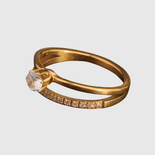 Ten pierścionek zachwyca elegancką złotą podstawą i błyszczącym centralnym kamieniem, który łapie światło przy każdym ruchu. Doskonały wybór dla kobiet o wyrafinowanym guście, które cenią klasykę i subtelność.